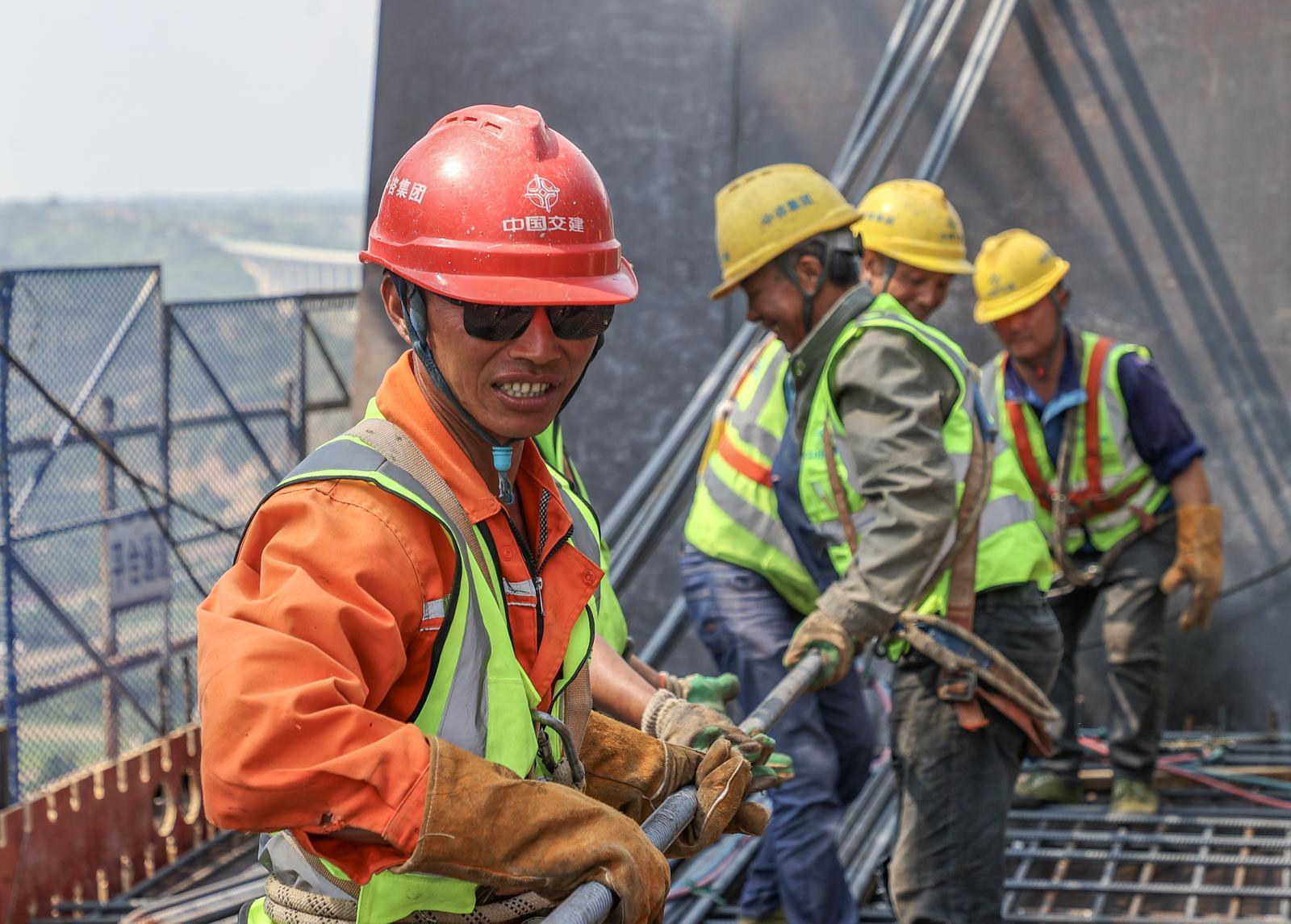 G309西合公路馬蓮河特大橋施工現(xiàn)場(chǎng),工人頂著高溫搬運(yùn)鋼筋。
