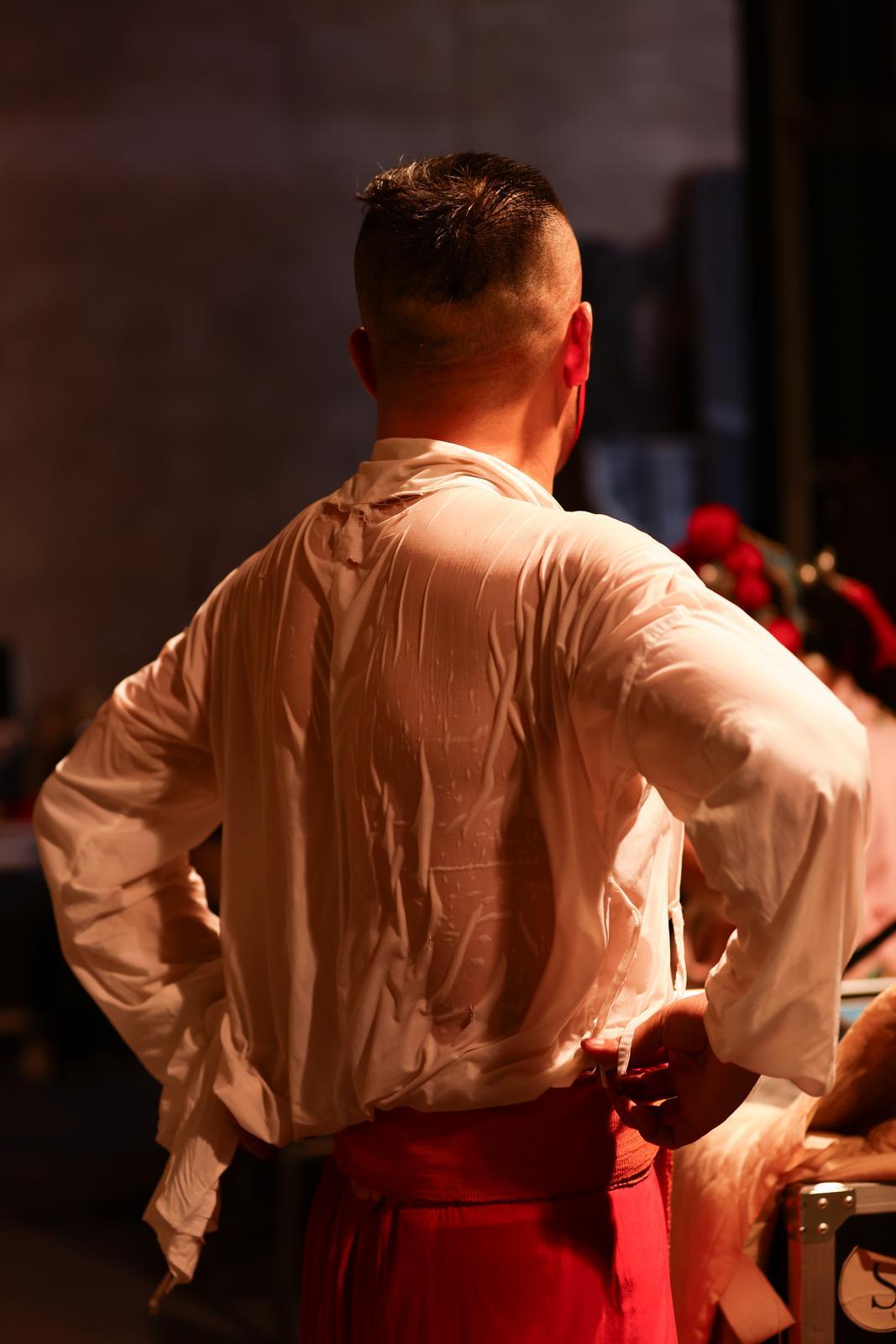 慶陽隴劇院演職人員高溫天氣堅(jiān)持開展惠民演出活動(dòng),汗水浸濕戲服。