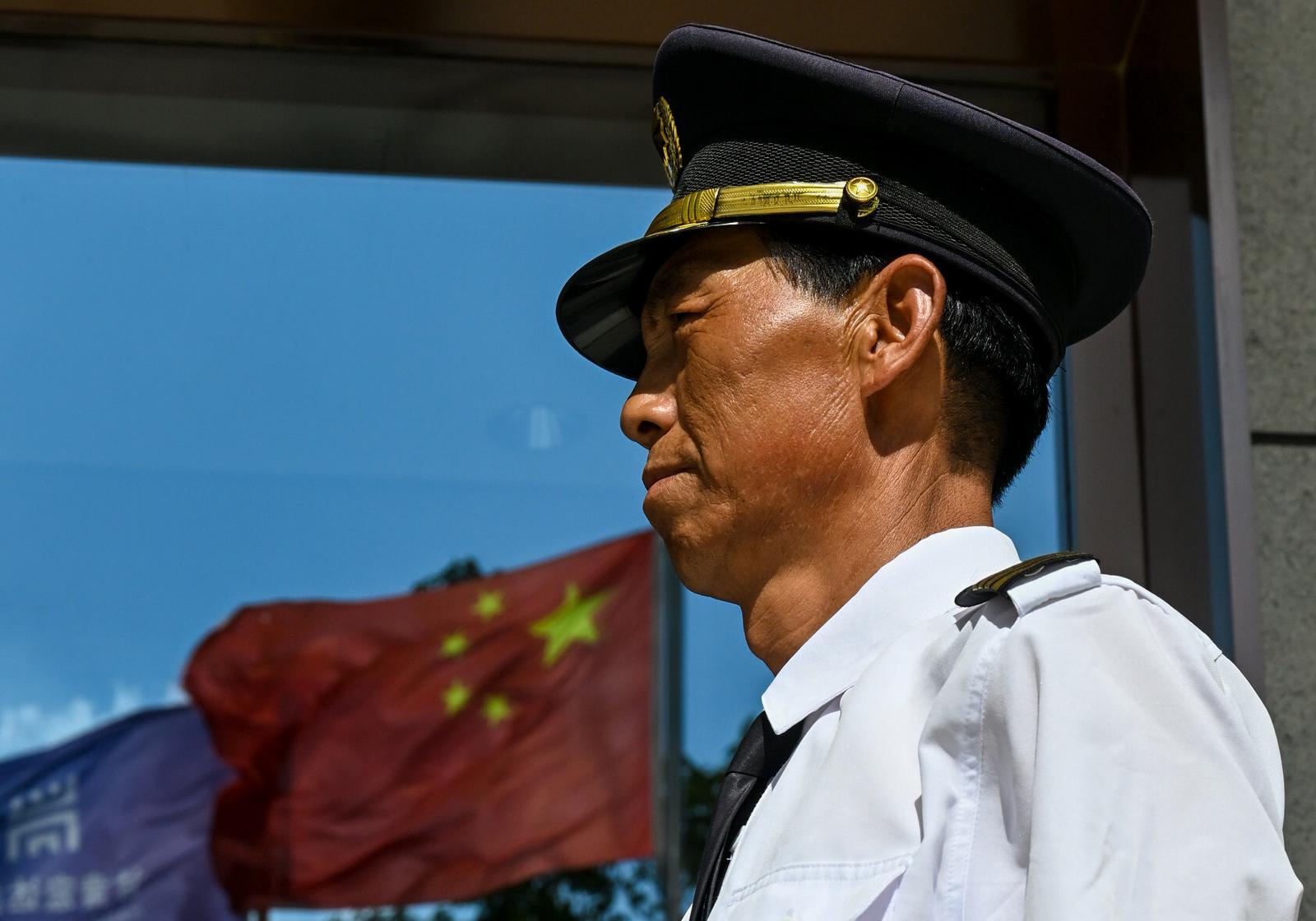 保安在高溫下堅(jiān)守崗位。