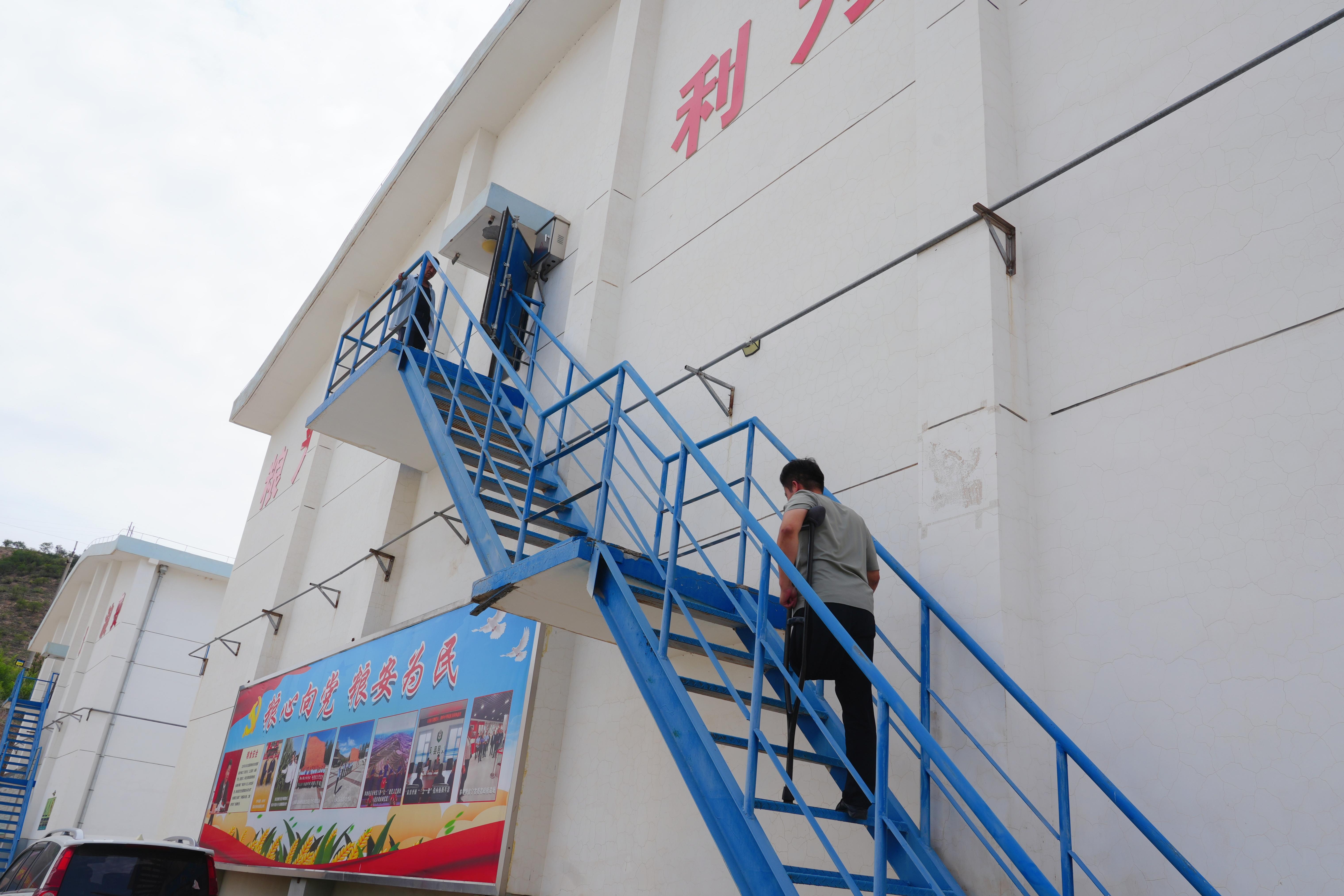 步入環(huán)縣民安糧油儲備有限公司的大門,迎面是排列整齊的6幢糧倉,倉房外側(cè)約6米高的鐵架臺階是每日查看糧情的必經(jīng)之路!常人都需走的小心翼翼,而郭建慧僅用一條腿、一只拐在這條“鐵架路”上風(fēng)雨無阻走過了五個年頭。