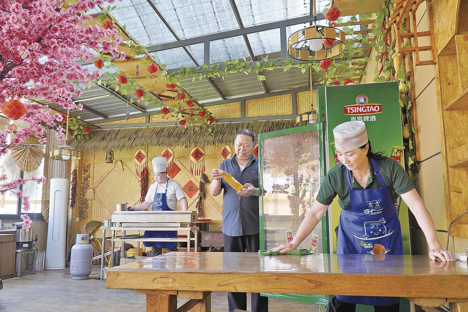 王畔村農(nóng)文旅融合發(fā)展服務(wù)中心田園燒烤坊工作人員做營業(yè)前準(zhǔn)備工作。