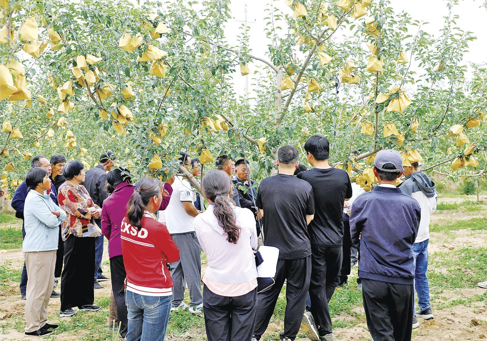 果農(nóng)在合道鎮(zhèn)朱家塬村蘋(píng)果示范園參觀學(xué)習(xí)。 慶陽(yáng)融媒記者 馬蓉蓉 攝