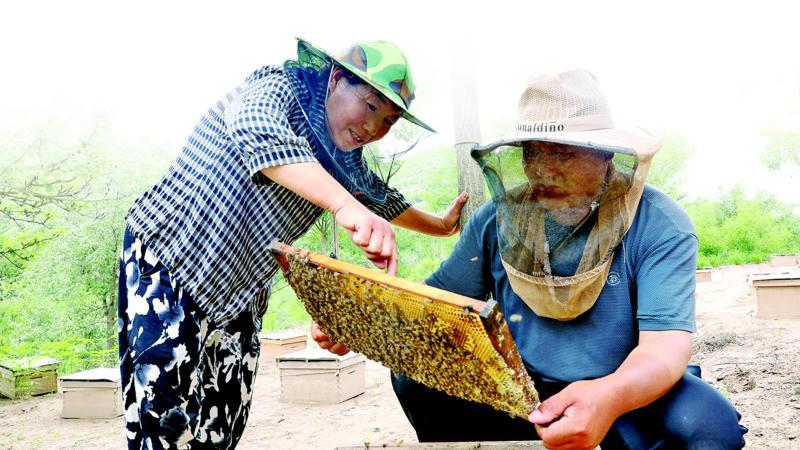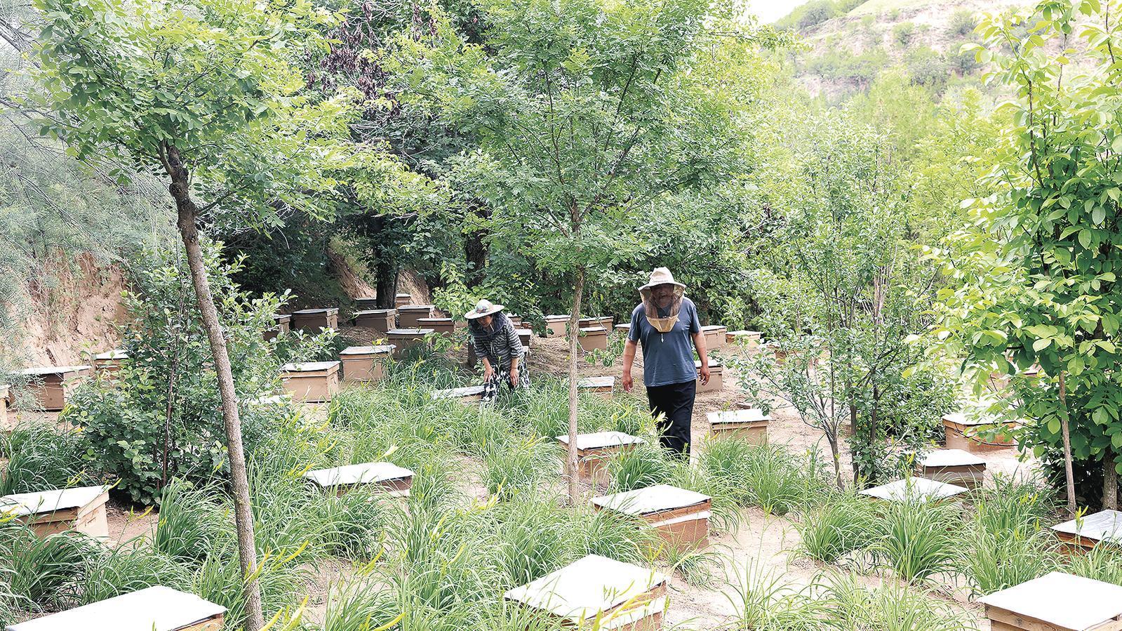 白馬鄉(xiāng)馬高莊村村民虞正山和妻子查看蜜蜂養(yǎng)殖情況。 通訊員 雷彩利 攝