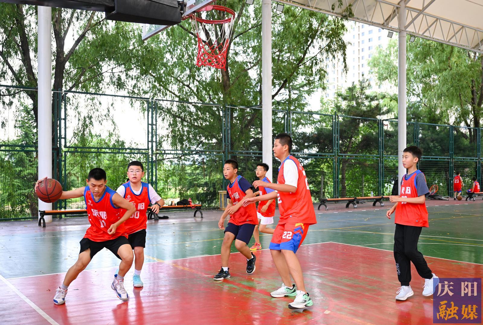 籃球場上,少年們運球快速變向,突破防守隊員,展現(xiàn)假期籃球訓(xùn)練成果。