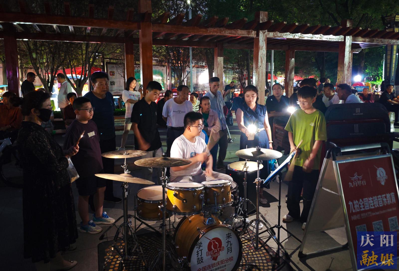 小鼓手在西峰區(qū)健身廣場表演架子鼓,奏響暑期活力樂章。