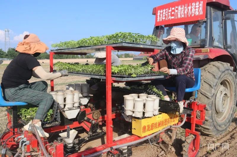 牽引式三行微松補(bǔ)水移栽機(jī)正在栽植紫蘇苗