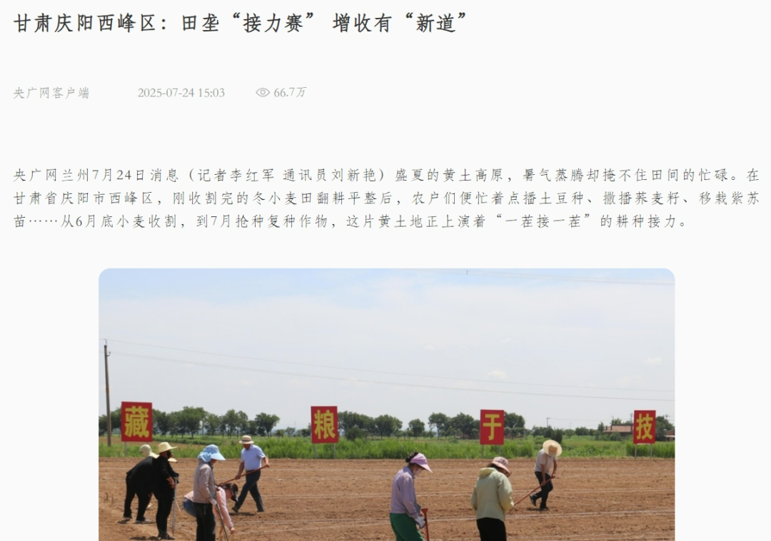 7月24日,“央廣網(wǎng)”客戶(hù)端發(fā)布《甘肅慶陽(yáng)西峰區(qū):田壟“接力賽” 增收有“新道”》。