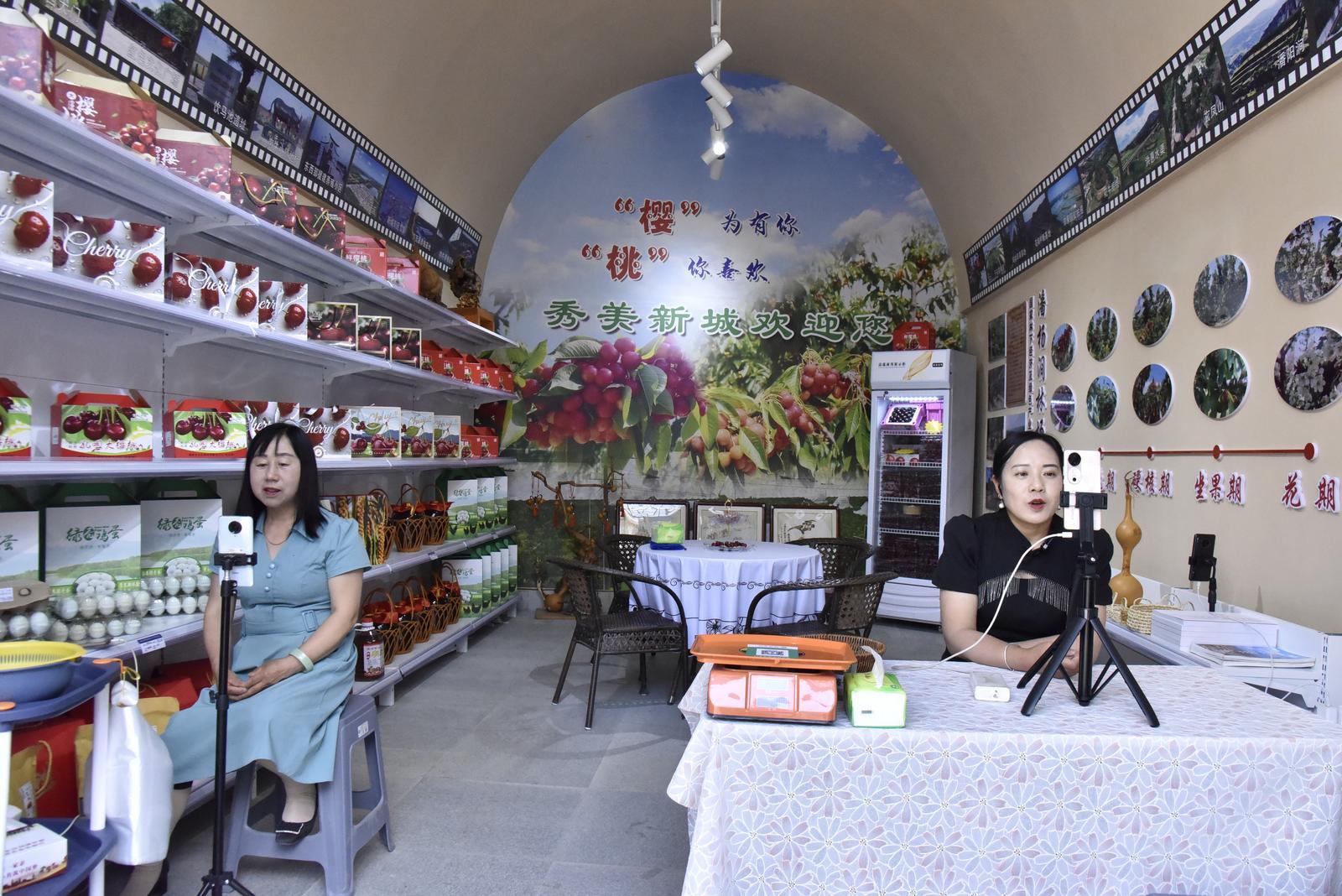 在北石窟驛景區(qū)“農(nóng)特產(chǎn)品進景區(qū)”活動現(xiàn)場,主播直播帶貨。 慶陽融媒記者 白勇濤 攝