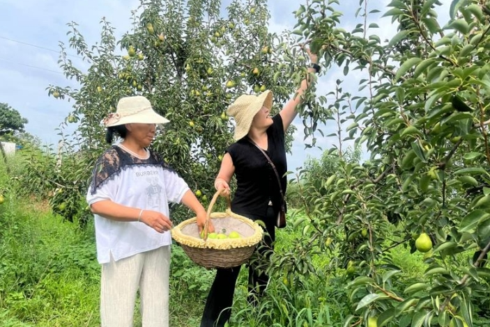 香蕉梨,又名貴妃梨、油瓶梨,由巴梨與鴨梨雜交培育而成。采摘后經(jīng)7-10天儲(chǔ)存,果肉會(huì)變得愈發(fā)軟糯香甜。其富含糖分、維生素及多種微量元素,具有潤(rùn)肺止咳、保護(hù)心血管等功效,尤其適合老人兒童食用。得益于充足的光照和前期的科學(xué)管護(hù),今年梨園迎來品質(zhì)大年,果實(shí)色澤亮麗、個(gè)頭勻稱,吸引了眾多游客前來體驗(yàn)采摘樂趣。