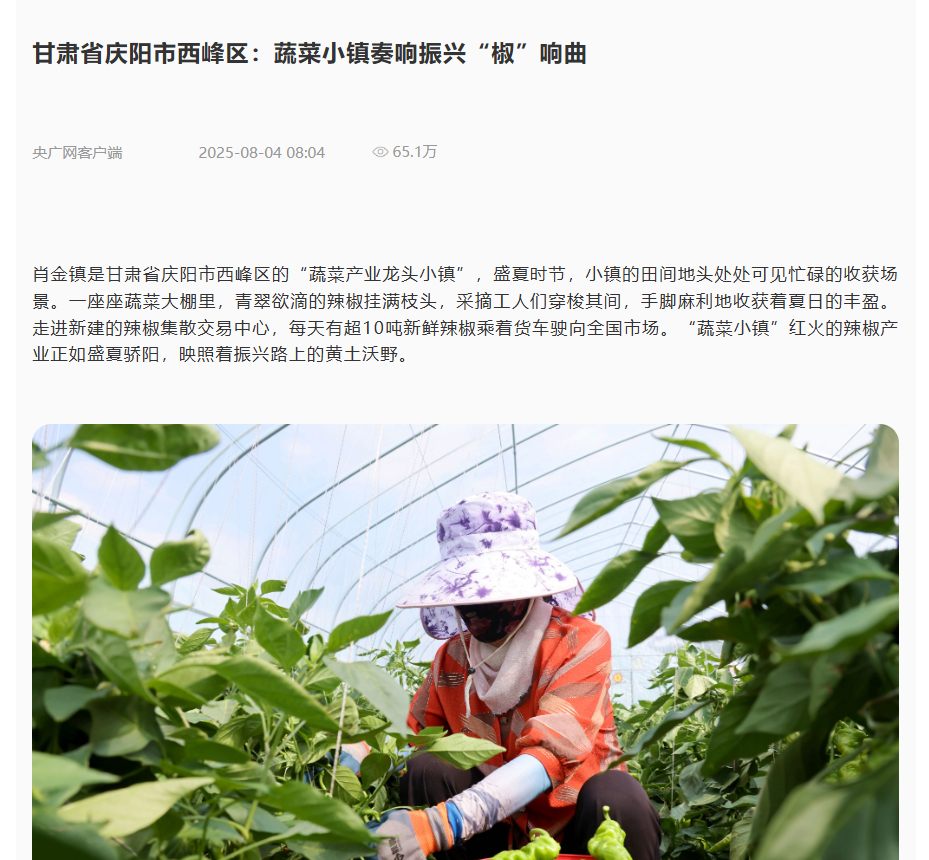 8月4日,“央廣網”客戶端發(fā)布《甘肅省慶陽市西峰區(qū):蔬菜小鎮(zhèn)奏響振興“椒”響曲》。