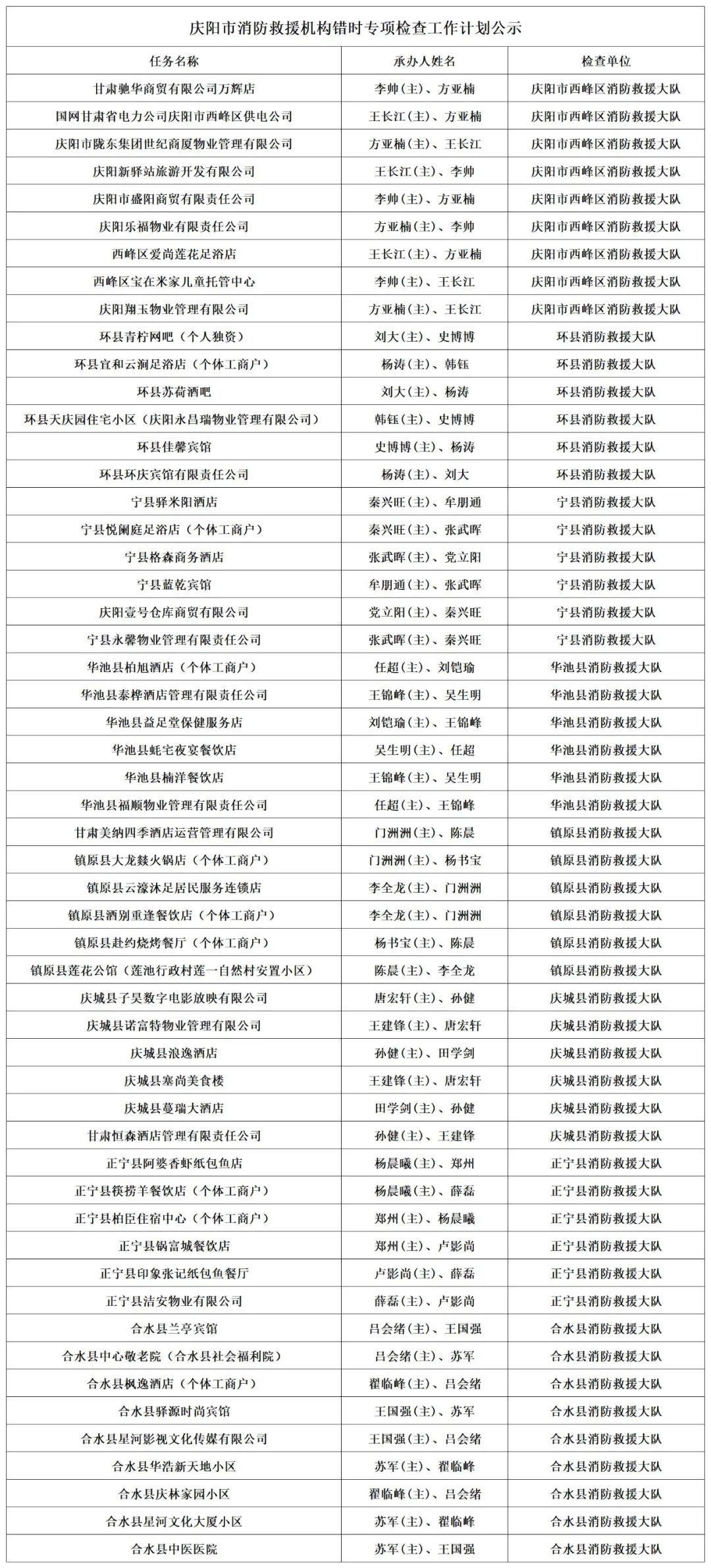 為全面做好電動(dòng)自行車、動(dòng)火作業(yè)全鏈條整治、暢通“生命通道”等工作,進(jìn)一步加強(qiáng)對(duì)夜間營(yíng)業(yè)場(chǎng)所消防安全監(jiān)管,重點(diǎn)糾治違規(guī)住人、電動(dòng)自行車違規(guī)停放充電、違規(guī)動(dòng)火作業(yè)、占堵消防通道等突出問(wèn)題,慶陽(yáng)市消防救援支隊(duì)決定8月16日晚和8月23日晚組織開(kāi)展錯(cuò)時(shí)專項(xiàng)檢查,現(xiàn)將此次錯(cuò)時(shí)專項(xiàng)檢查計(jì)劃公示如下: