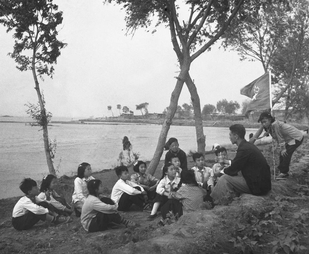 1955年,在河北白洋淀,新安小學(xué)的少先隊員們聽曾擔(dān)任過抗戰(zhàn)時期兒童團(tuán)團(tuán)長的陳殿元講抗戰(zhàn)故事。