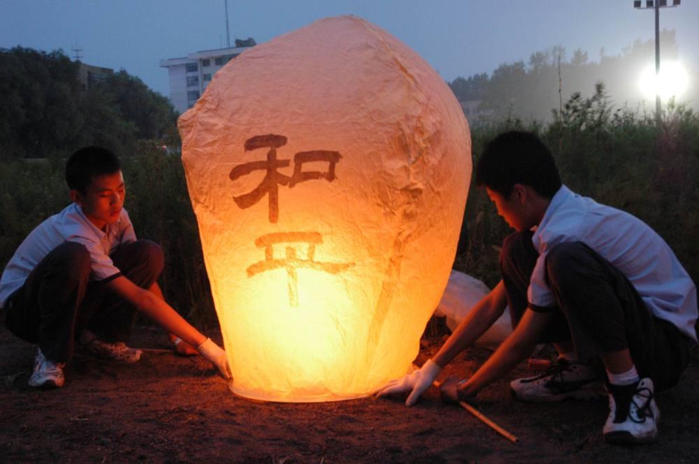 2005年8月15日,近萬名各界群眾聚集在哈爾濱市平房區(qū)侵華日軍第七三一部隊罪證陳列館,舉行祈禱和平活動。這是市民點燃孔明燈。