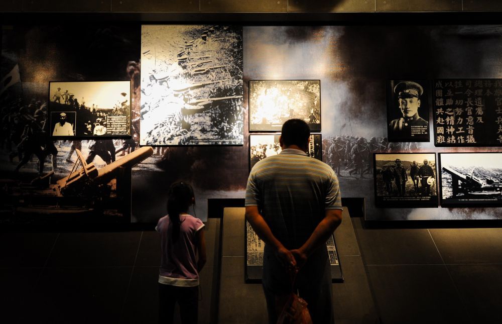 2013年8月15日,吉林省長春市各界人士來到位于偽滿皇宮博物院內(nèi)的東北淪陷史紀(jì)念館,參觀日本侵略中國東北史實展覽,緬懷抗戰(zhàn)英烈。這是一對父女在參觀展覽。