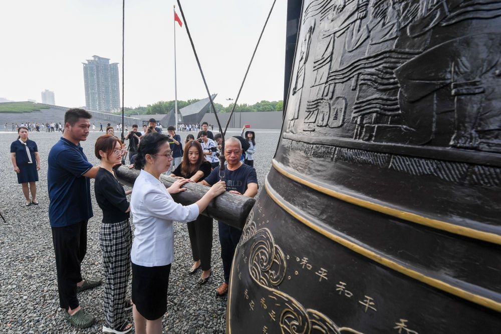 2023年8月15日,南京大屠殺幸存者后代代表在侵華日軍南京大屠殺遇難同胞紀(jì)念館公祭廣場撞響和平大鐘,祈福和平。