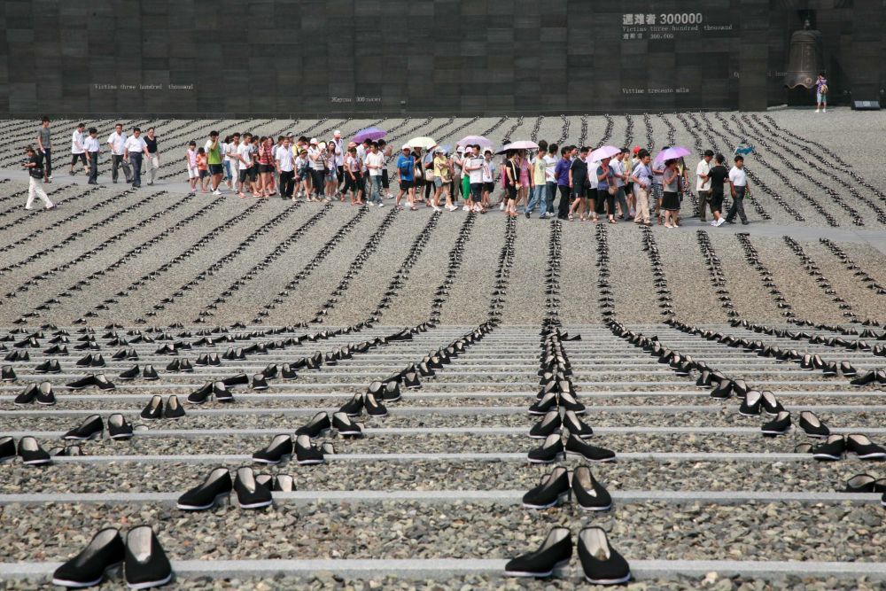 2010年8月15日,在侵華日軍南京大屠殺遇難同胞紀(jì)念館的和平公園,6830雙布鞋被整齊擺放,紀(jì)念在日本遇害的中國勞工。