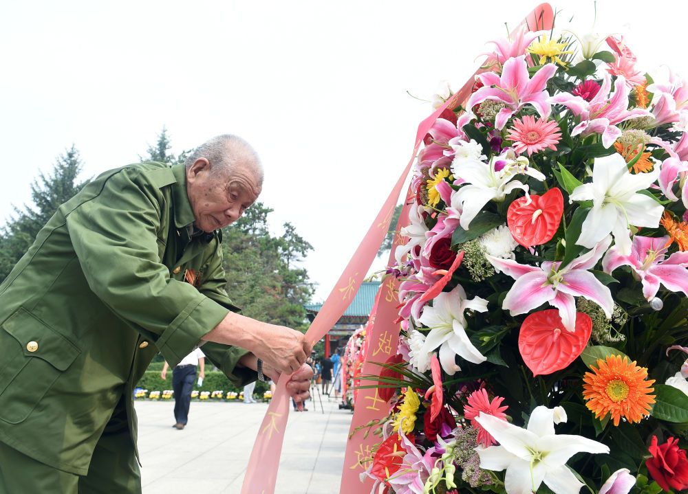 2015年8月15日,吉林省紀(jì)念東北抗聯(lián)精神大會在吉林通化舉行,各界群眾來到通化市楊靖宇烈士陵園,緬懷犧牲的東北抗聯(lián)將士。這是一位東北抗聯(lián)老戰(zhàn)士為烈士敬獻(xiàn)花圈。