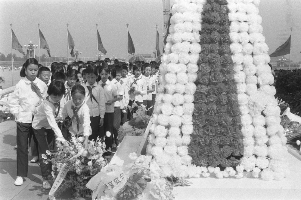 1985年,首都各界代表在天安門廣場人民英雄紀(jì)念碑前舉行獻(xiàn)花圈儀式,追念在抗日戰(zhàn)爭中犧牲的將士和死難同胞。這是海淀區(qū)少先隊員在敬獻(xiàn)花圈。