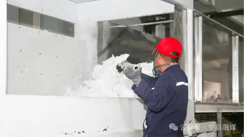 “世寧新材年產(chǎn)1.25萬噸微纖維玻璃棉生產(chǎn)線是全國唯一實現(xiàn)離心法生產(chǎn)29度和34度微纖維玻璃棉的生產(chǎn)線,對于生產(chǎn)技術來說,它實現(xiàn)了節(jié)能減排,碳中和的重要任務指標,它生產(chǎn)的微纖維玻璃棉只有頭發(fā)絲的一百五十分之一,主要應用于儲能電池,高效節(jié)能,空氣環(huán)保過濾三大領域?!备拭C世寧新型材料有限公司工程師劉琛介紹說。