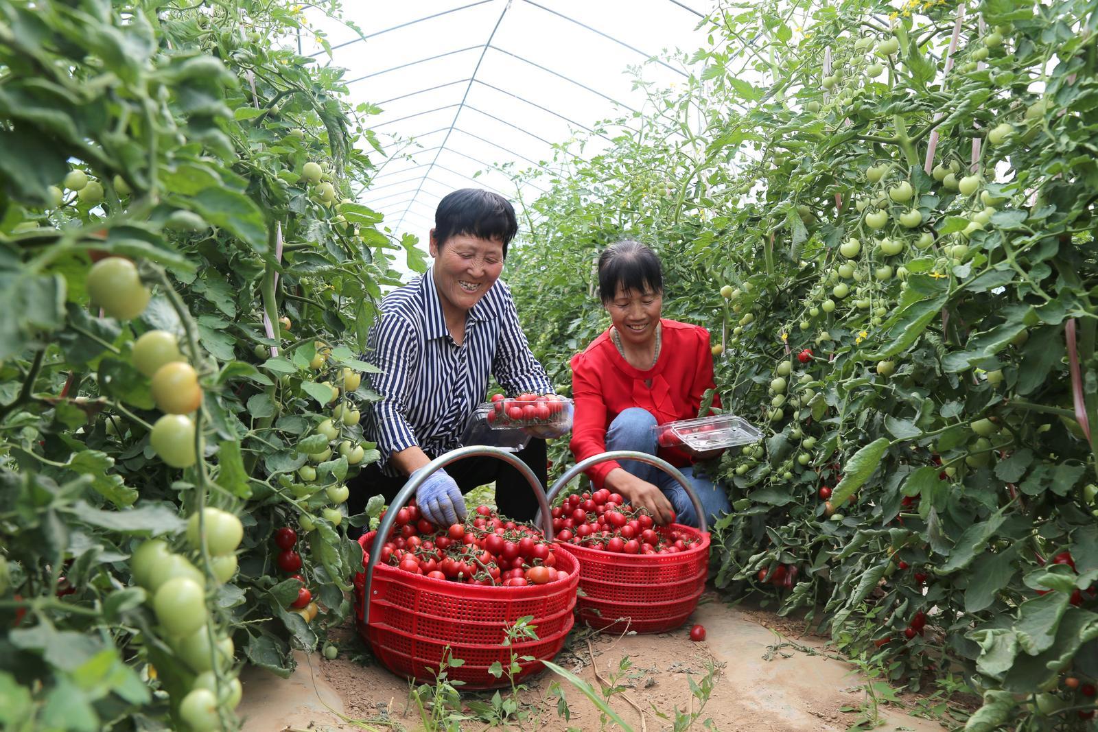 西峰區(qū)肖金鎮(zhèn)冉李村設(shè)施大棚里群眾采收圣女果。