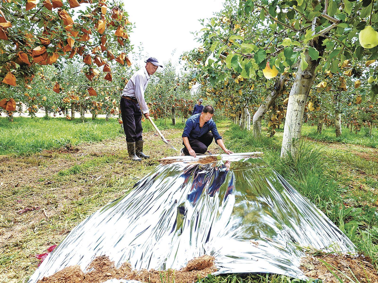 走進(jìn)后官寨鎮(zhèn)溝畎村的慶陽春滿園種植養(yǎng)殖農(nóng)民專業(yè)合作社的果園,碩大的蘋果掛滿枝頭。果農(nóng)們手法嫻熟,小心翼翼地為蘋果褪去果袋。一旁的工人們彎著腰,細(xì)致地鋪設(shè)反光膜?!斑@幾天,我們投入了20多名工人,主要任務(wù)就是摘袋和鋪膜?!焙献魃绻ぷ魅藛T田希社介紹,反光膜可以有效反射陽光,確保蘋果全方位均勻受光,顯著提升果品的著色度和糖分積累,從而增加果品價(jià)值。