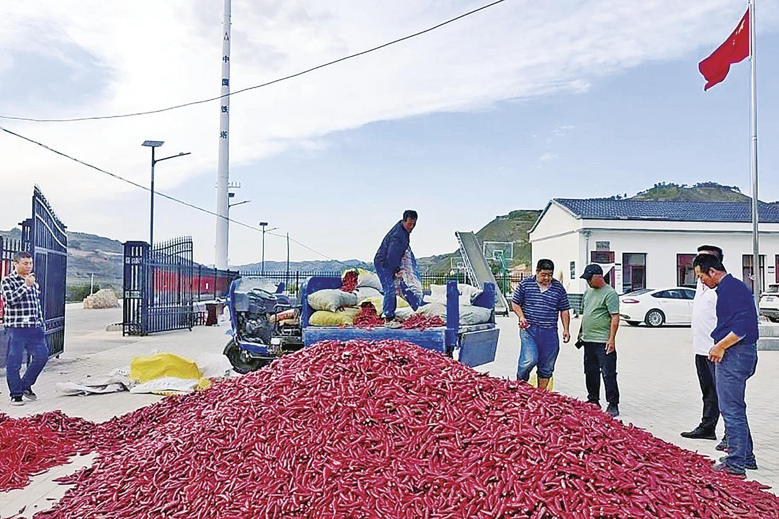 白家川村群眾在收購(gòu)點(diǎn)交售采摘的辣椒。 慶陽融媒記者 白勇濤 攝