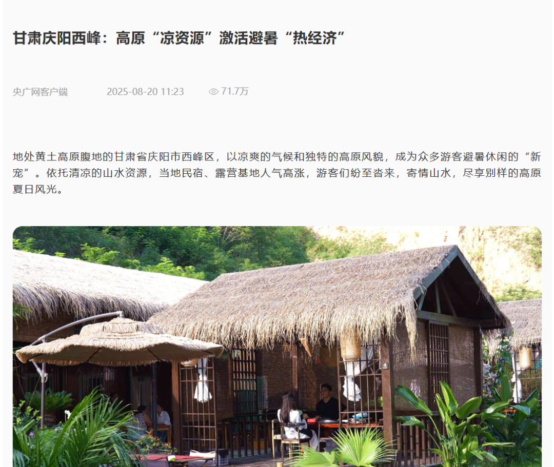 8月20日,“央廣網(wǎng)”客戶(hù)端發(fā)布《甘肅慶陽(yáng)西峰:高原“涼資源”激活避暑“熱經(jīng)濟(jì)”》。