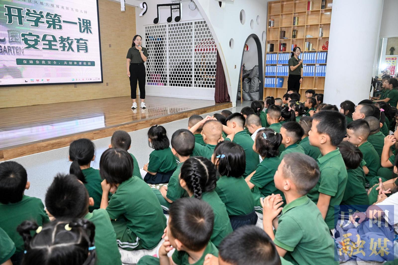 西峰區(qū)博苑陽光幼兒園,老師為小朋友們普及安全教育第一課。