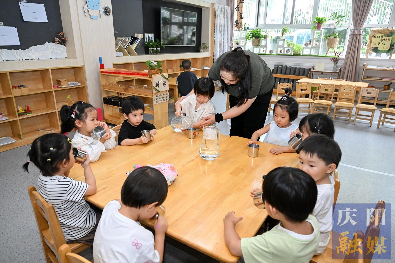 西峰區(qū)博苑陽光幼兒園的小朋友們在學(xué)習(xí)生活技能。