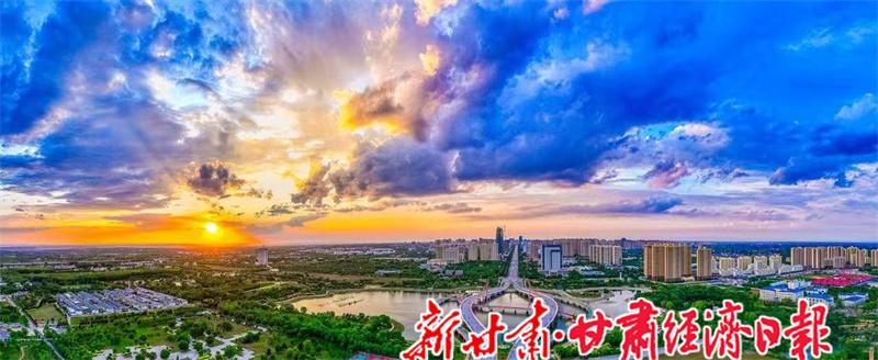 西峰區(qū)天空中晚霞與彩虹橋相互映襯,繪就一幅浪漫迷人的城市畫卷。(圖片由慶陽市委宣傳部提供)