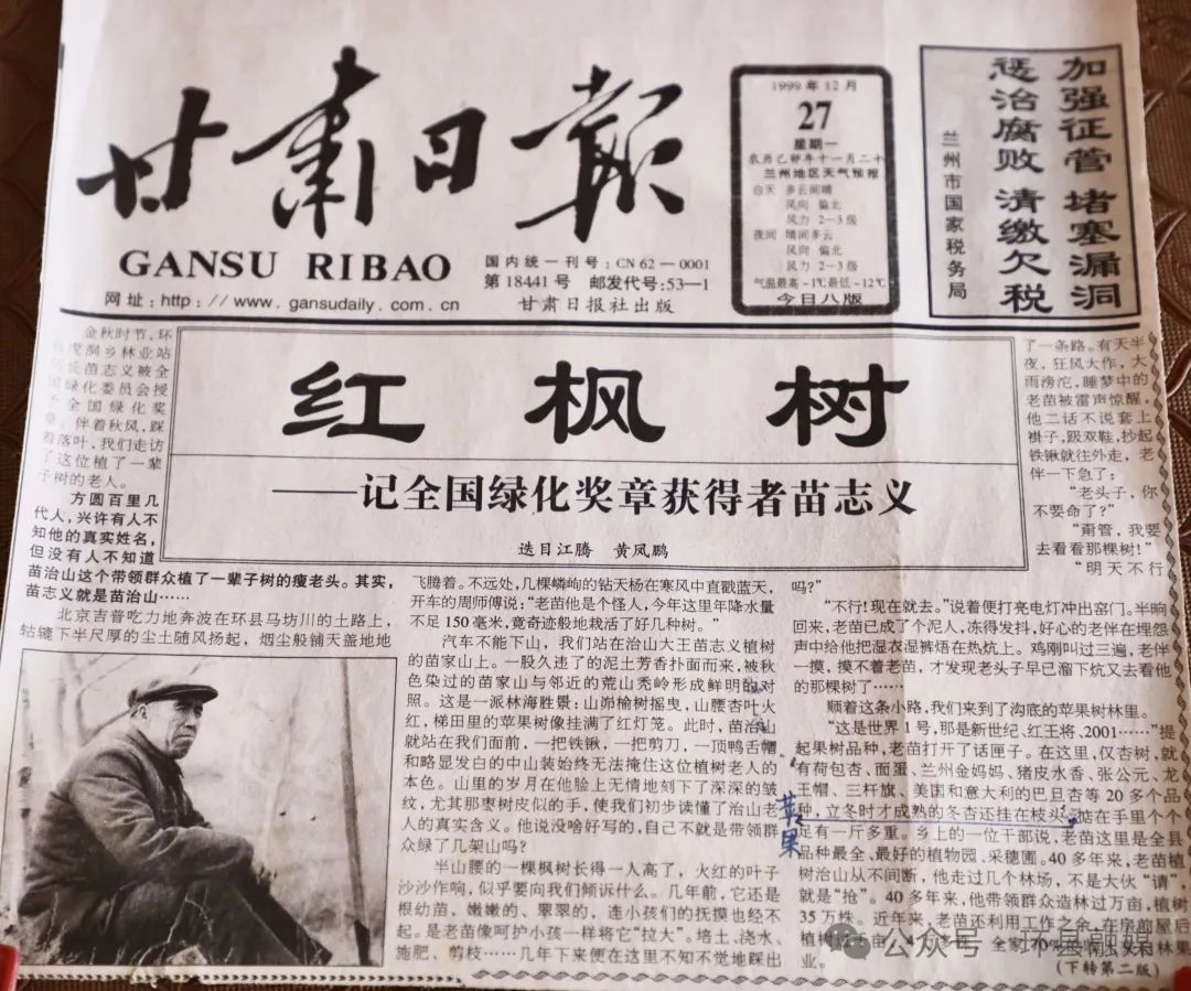 20多年前,記者以《紅楓樹》為題報道苗志義事跡時,這片山地還只是零星點綴著綠意。如今放眼望去,杏樹、桃樹、柏樹、松樹、楊樹、銀杏組成的混交林已連綿覆蓋幾座山頭,形成名副其實的“綠洲”。老人顫巍的手輕撫過紅楓粗糙的樹皮,聲音沉靜而篤定:“這棵樹比我還能扛,風(fēng)沙再大,它一扎根,春天照樣發(fā)新枝?!?/p>