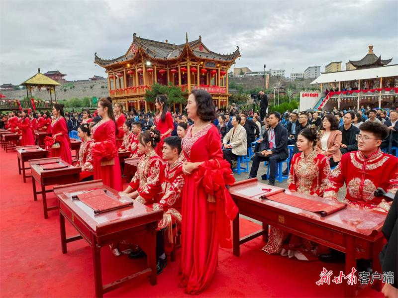 啟動(dòng)儀式上,新人代表向全社會(huì)發(fā)出《抵制高額彩禮 倡樹婚戀新風(fēng)》倡議。隨后,隴東文明婚俗展示暨文藝演出以穿越式情景婚禮為主線,古慶州知州范仲淹“穿越”擔(dān)任主婚人,15對(duì)新人行“三拜禮”、飲合巹酒、宣讀文明誓言,省民政廳負(fù)責(zé)同志為新人頒發(fā)結(jié)婚證,與會(huì)嘉賓向新人送上“新風(fēng)禮包”祝福。