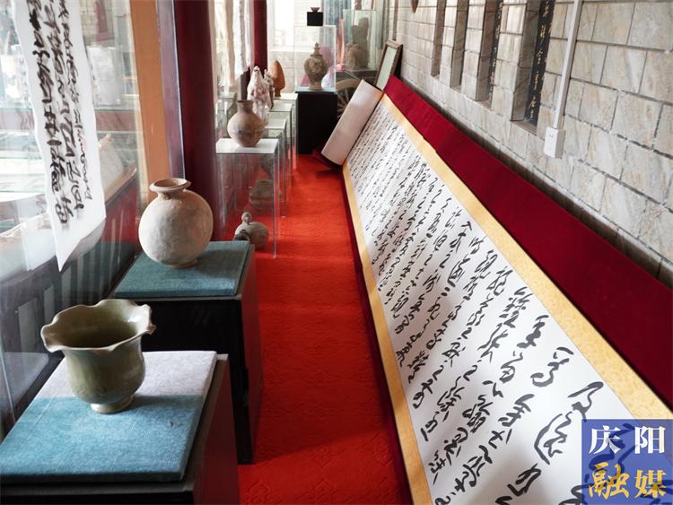 走進館內(nèi),只見過道、廊柱、墻壁等處皆是名家的書法作品,展示廳內(nèi)還陳列著不少刺繡、石刻、陶器等藝術(shù)品,而館外的圍墻上,由116塊書法碑刻組成的百米長廊,匯集了于右任的風骨、焦氏先祖的智慧與焦宏澤本人的筆墨。