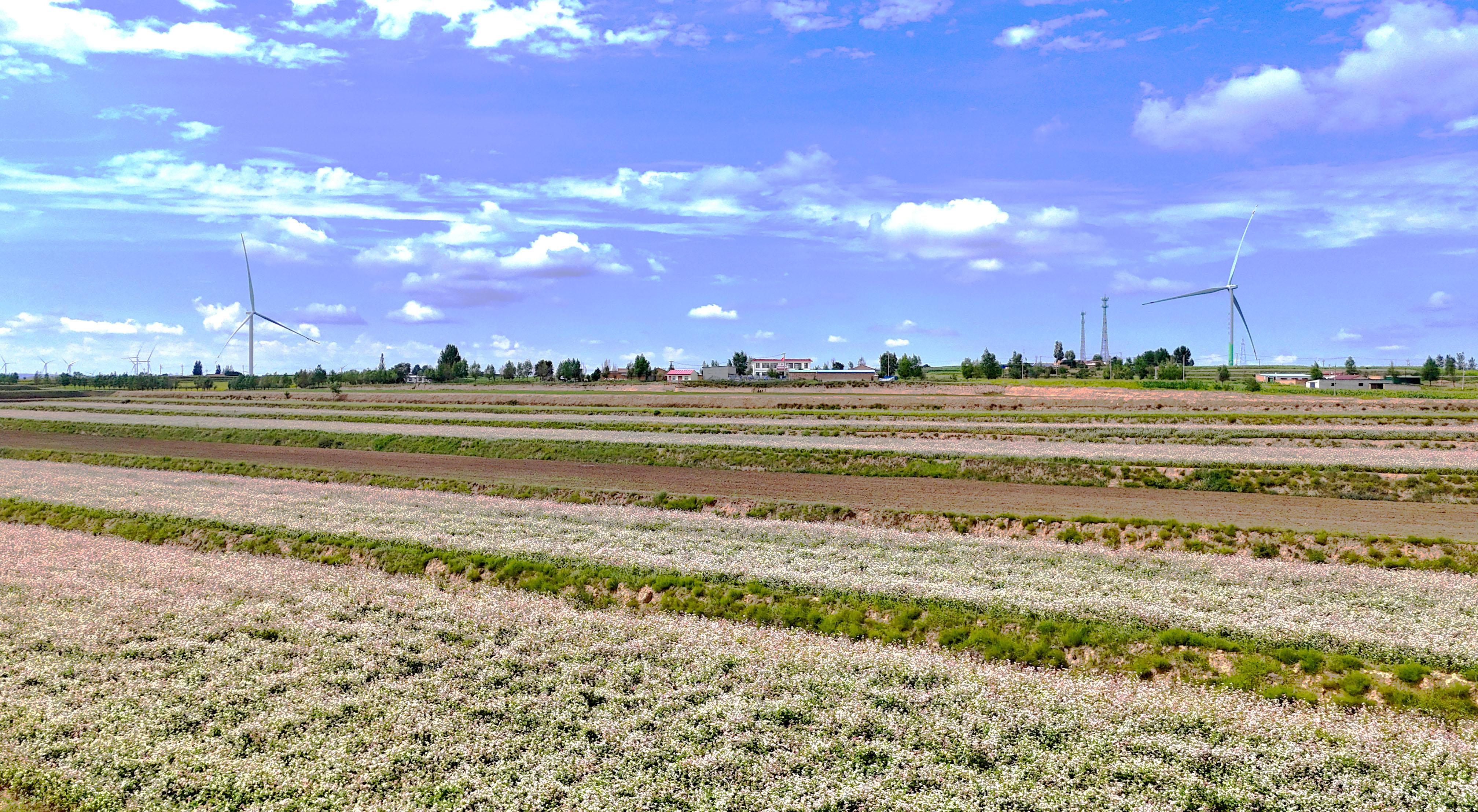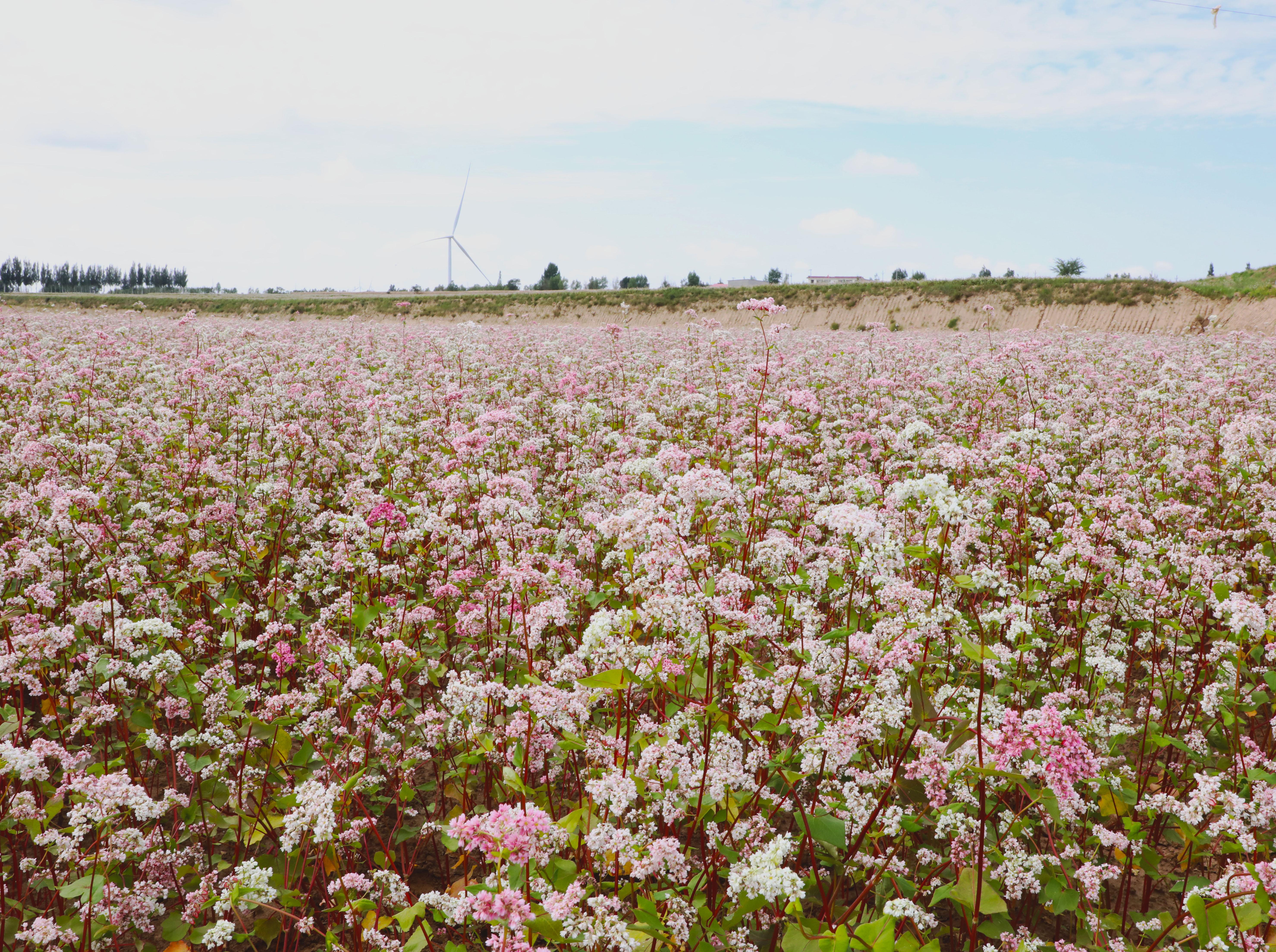 秋風(fēng)拂過,花簇層層起伏,時(shí)而像無數(shù)粉蝶蹁躚,時(shí)而如粉色波浪涌動(dòng)。蜜蜂嗡嗡穿梭其間,淡淡清香漫過山梁,沁人心脾。藍(lán)天白云下,蕎麥花海與周邊田野、山巒、大風(fēng)車相映成趣,既繪就了田園美景,也孕育著豐收的希望。