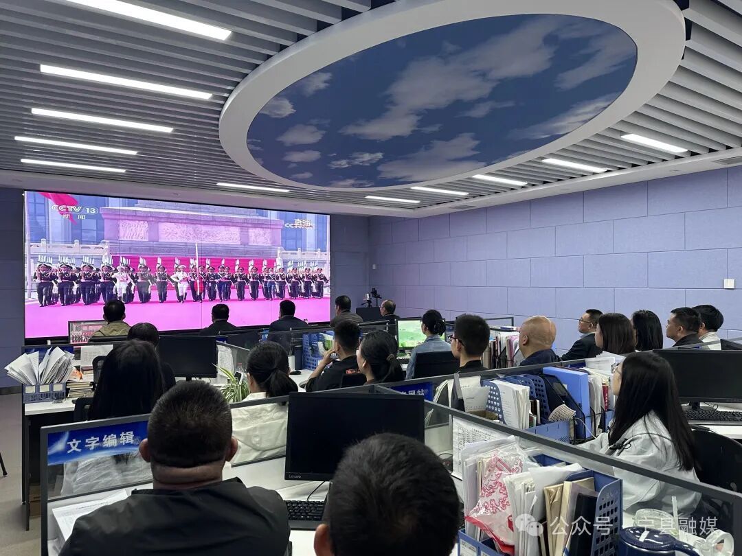 縣政府辦干部職工早早聚集在會(huì)議室,等待大會(huì)開(kāi)始??h市場(chǎng)監(jiān)管局也組織干部職工在會(huì)議室集中收看了紀(jì)念大會(huì)直播。大家整齊地坐在電視機(jī)前,神情專注地觀看閱兵式。