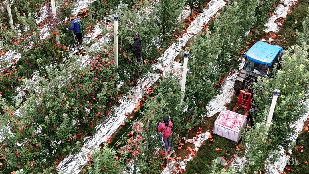 工人正在正洋蘋(píng)果公園采摘蘋(píng)果