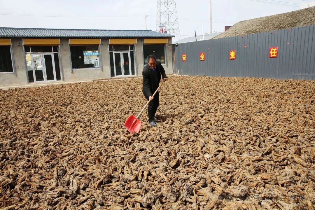 東會(huì)中藥材就業(yè)工廠(chǎng)負(fù)責(zé)人張新會(huì)正在晾曬大黃