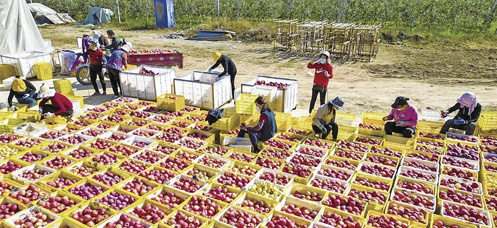 永和鎮(zhèn)安興村果農(nóng)將蘋(píng)果分揀裝箱。