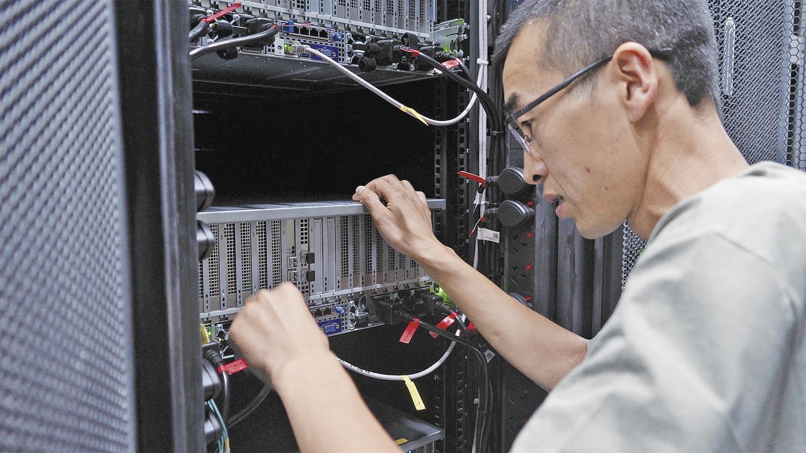 在中國移動(甘肅·慶陽)數(shù)據(jù)中心N01新型工業(yè)化數(shù)據(jù)中心機房里,億算智能的工程師在進行設(shè)備調(diào)試工作。 慶陽融媒記者 馮喜斌 攝