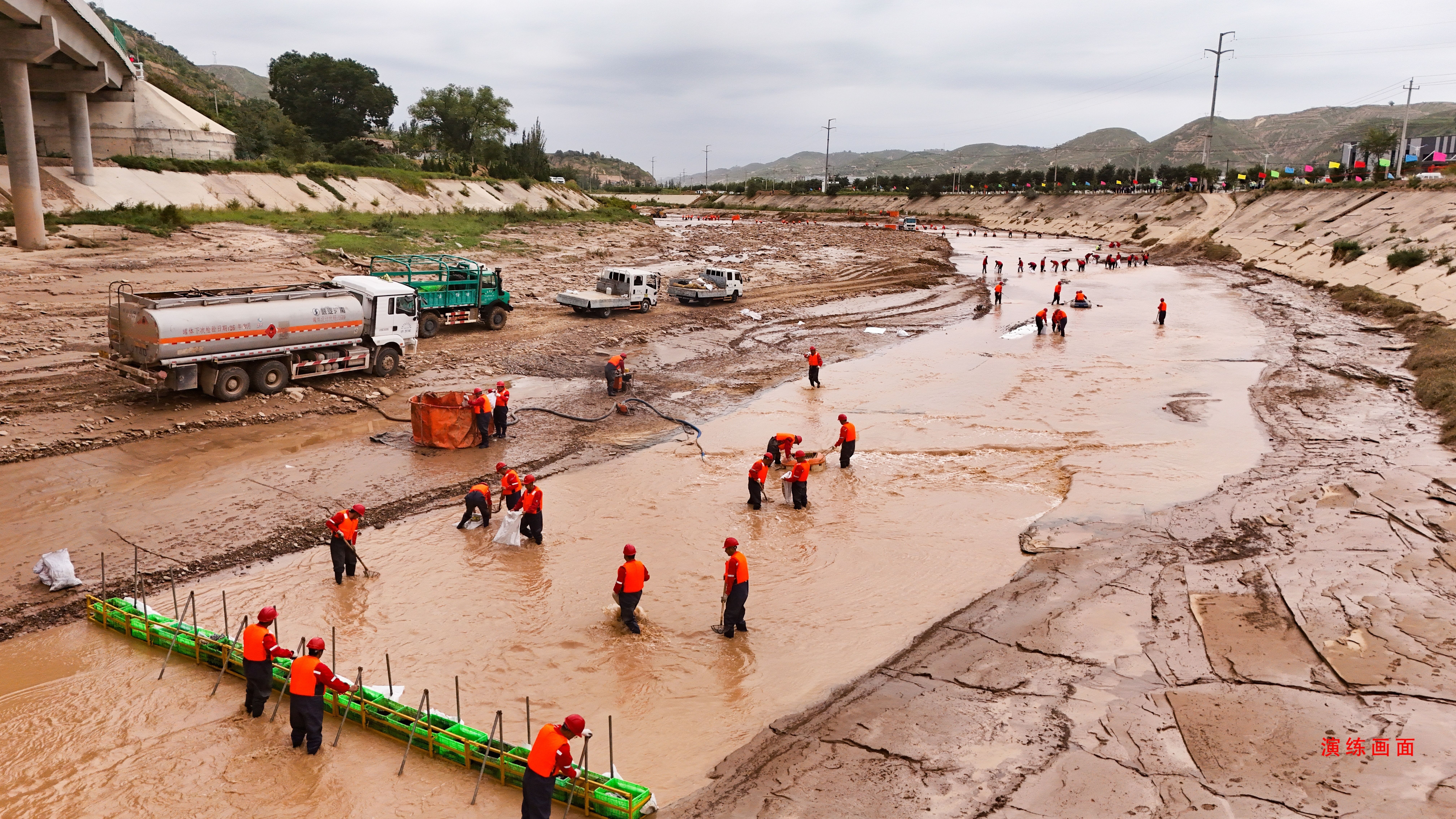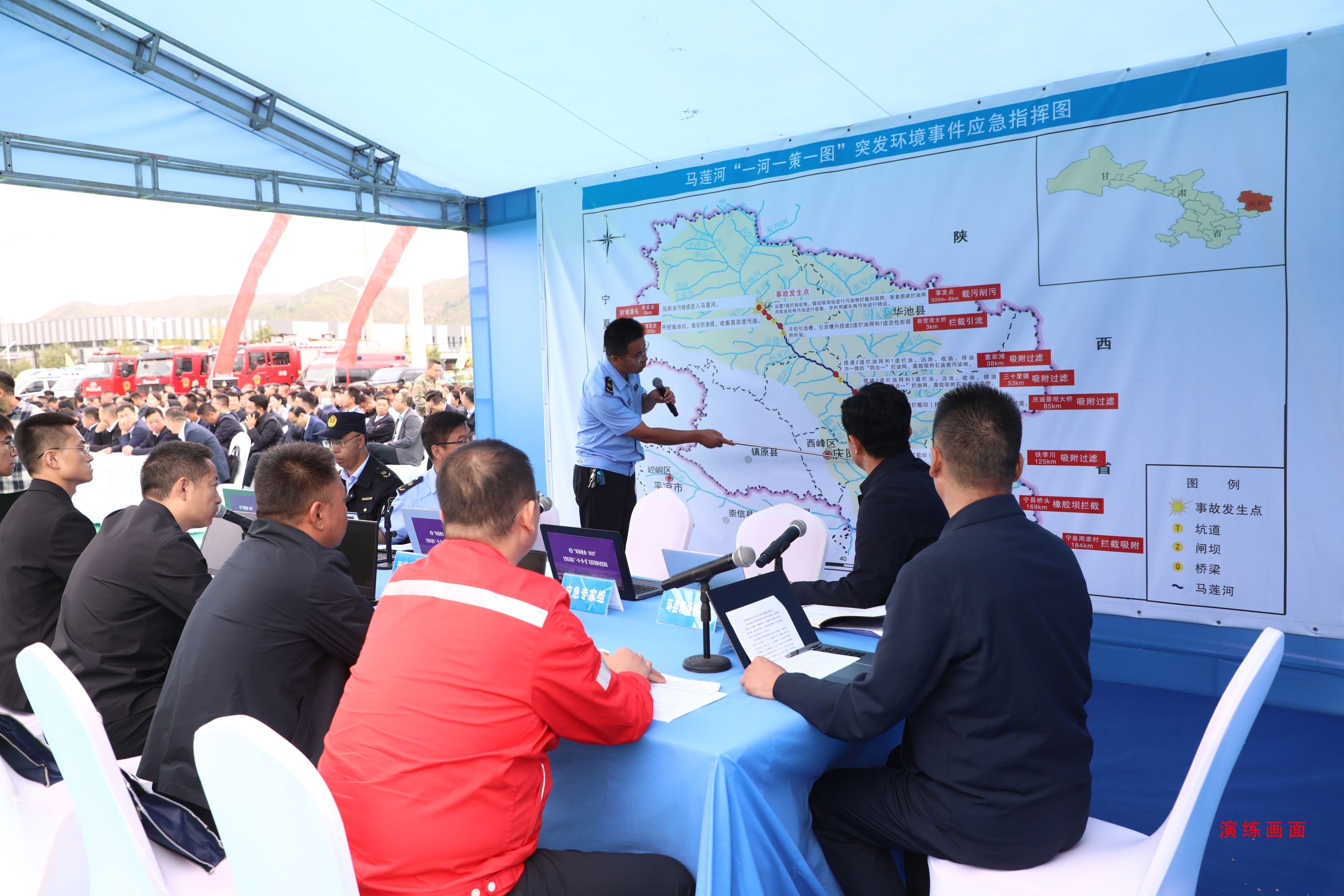 演練聚焦兩類典型水污染場景:一是模擬長慶油田公司第二采油廠樊家川作業(yè)區(qū)嶺四轉(zhuǎn)原油外輸管線距站6km處,因暴雨導(dǎo)致山體塌方造成原油外輸管線破損,原油流入馬蓮河,嚴重威脅水環(huán)境安全;二是模擬一輛裝有23t的濃硫酸罐車在慶城五里坡大橋與護欄發(fā)生碰撞,導(dǎo)致罐體破裂,濃硫酸流入馬蓮河。