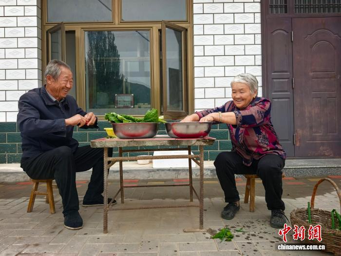 9月初,甘肅省慶陽(yáng)市環(huán)縣洪德鎮(zhèn)許旗村,村民繆尚才夫婦在新建的抗震房前摘洗新鮮蔬菜。楊蕊 攝