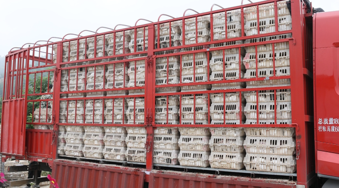 養(yǎng)殖基地內(nèi),工人穿著統(tǒng)一工作服,將肉兔從兔籠轉(zhuǎn)移至周轉(zhuǎn)箱,周轉(zhuǎn)箱整齊堆疊后裝入貨車,檢疫人員仔細檢查肉兔健康狀況,在檢疫合格單上簽字確認,貨車駕駛員關閉車廂門,張貼封條后發(fā)動車輛。