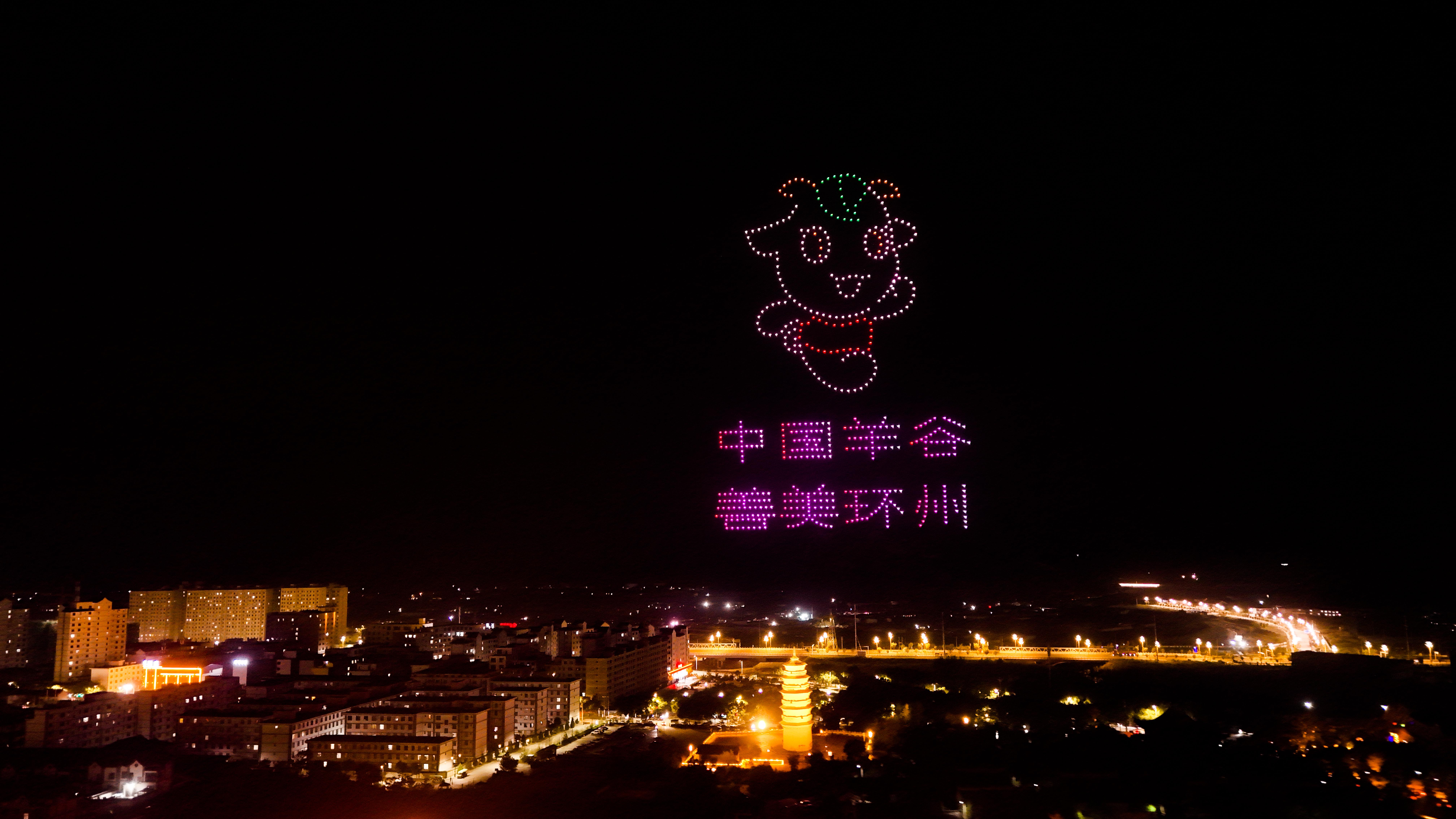 表演以“環(huán)環(huán)迎賓-耕耘印記-豐收禮贊-時(shí)代華章”四個(gè)篇章徐徐展開。開篇的“環(huán)環(huán)迎賓”篇章中,可愛的吉祥物形象在夜空中俏皮眨眼、揮手,“中國羊谷 善美環(huán)州”的字樣逐字顯現(xiàn),瞬間點(diǎn)燃現(xiàn)場氣氛,向八方來客發(fā)出熱情邀約。緊接著,“三羊開泰”的畫面靈動(dòng)呈現(xiàn),三只小羊躍動(dòng)其間,“環(huán)縣歡迎你”的文字隨之逐個(gè)出現(xiàn)并刷光,生動(dòng)展現(xiàn)了環(huán)縣羊產(chǎn)業(yè)的蓬勃活力。