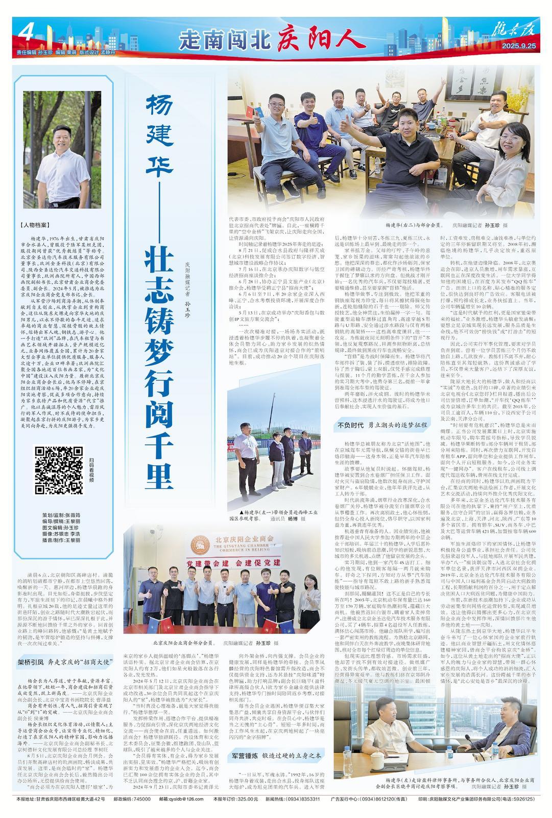 從隴東熱土到京華大地,楊建華以半生奮斗書寫了一位心懷家國(guó)的企業(yè)家前行軌跡。他以商業(yè)智慧開疆拓土,用文化情懷搭建精神家園,借商會(huì)平臺(tái)構(gòu)筑京慶“金橋”。如今,這位從黃土地走出的“招商大使”,正以軍人的魄力與企業(yè)家的智慧,帶領(lǐng)一群心懷感恩的慶陽(yáng)人,將個(gè)人成功的涓涓細(xì)流,匯入家鄉(xiāng)發(fā)展的浩蕩長(zhǎng)河。這份跨越千里的赤子情懷,是“此心安處是吾鄉(xiāng)”最深沉的詮釋。