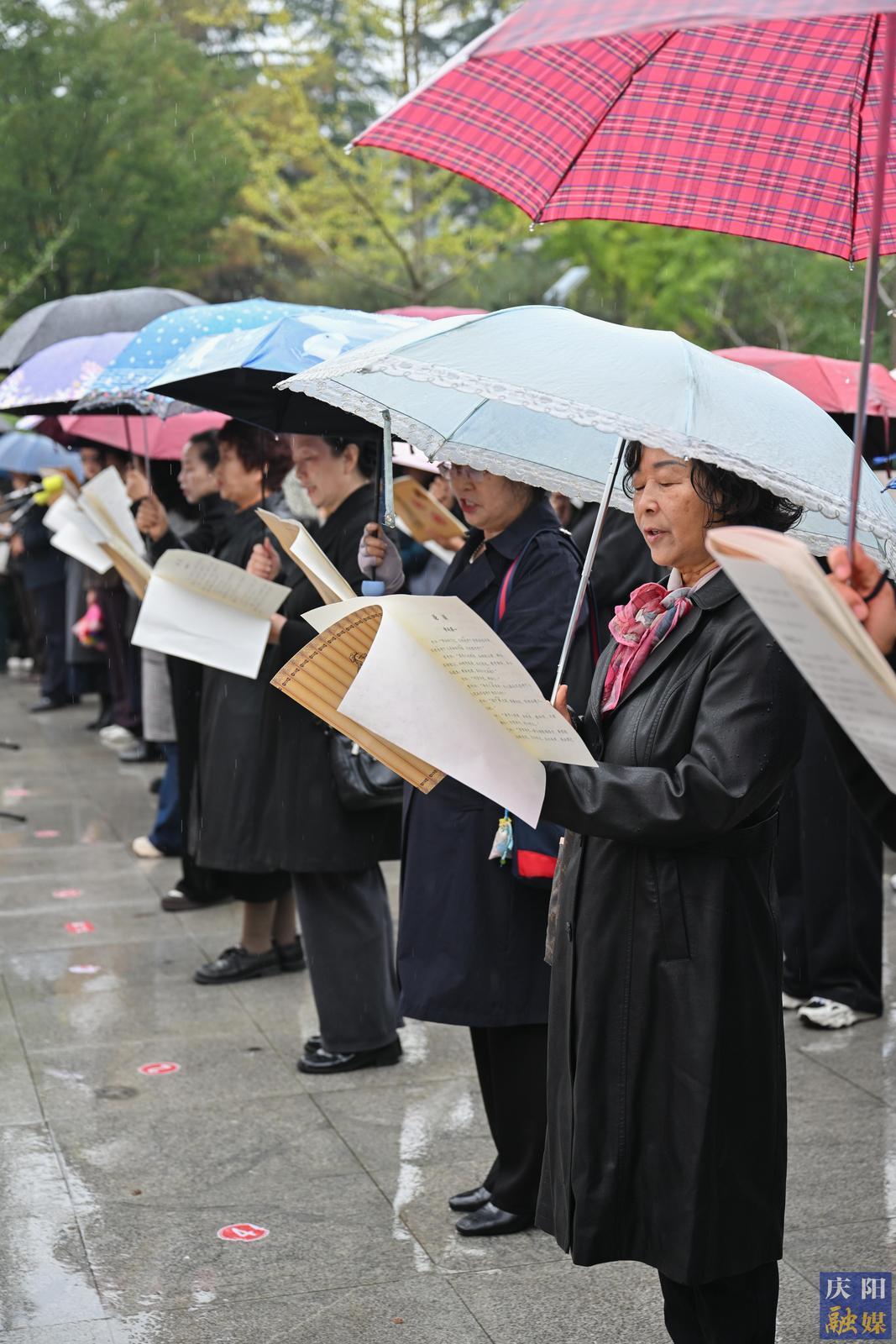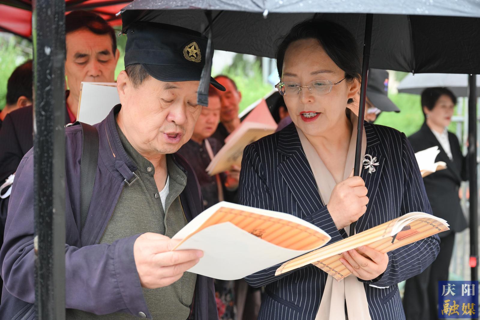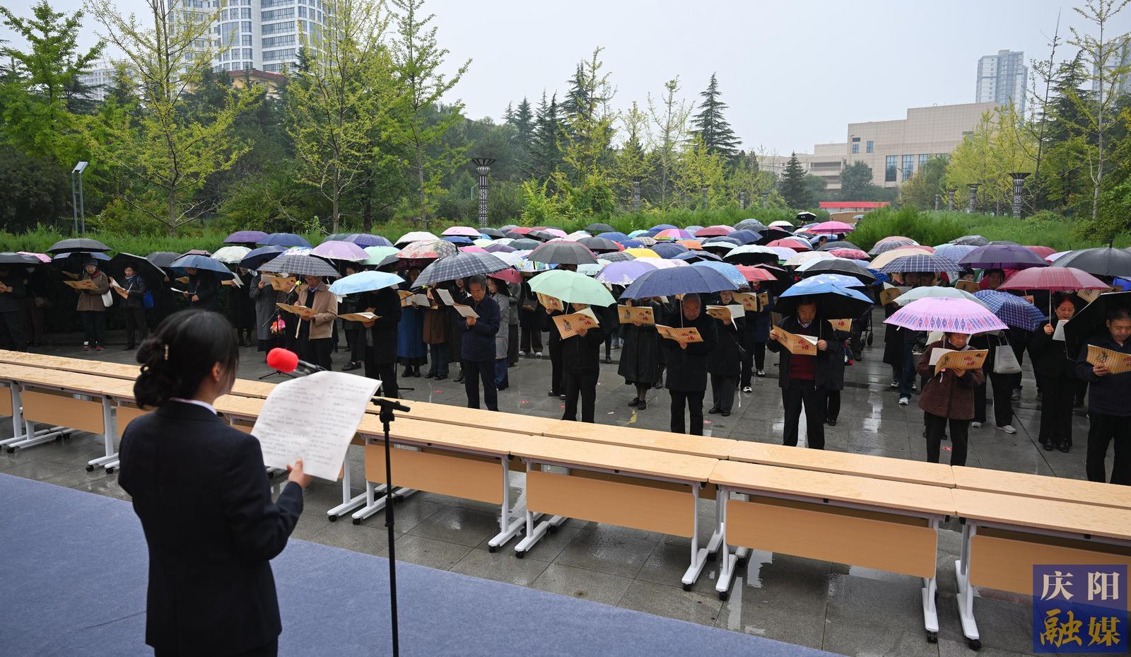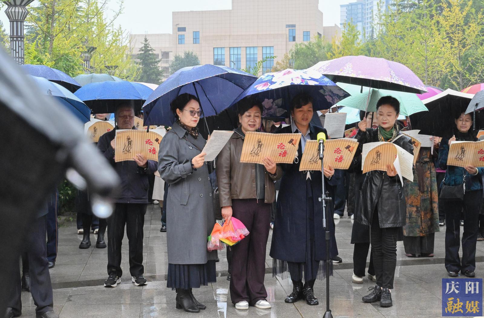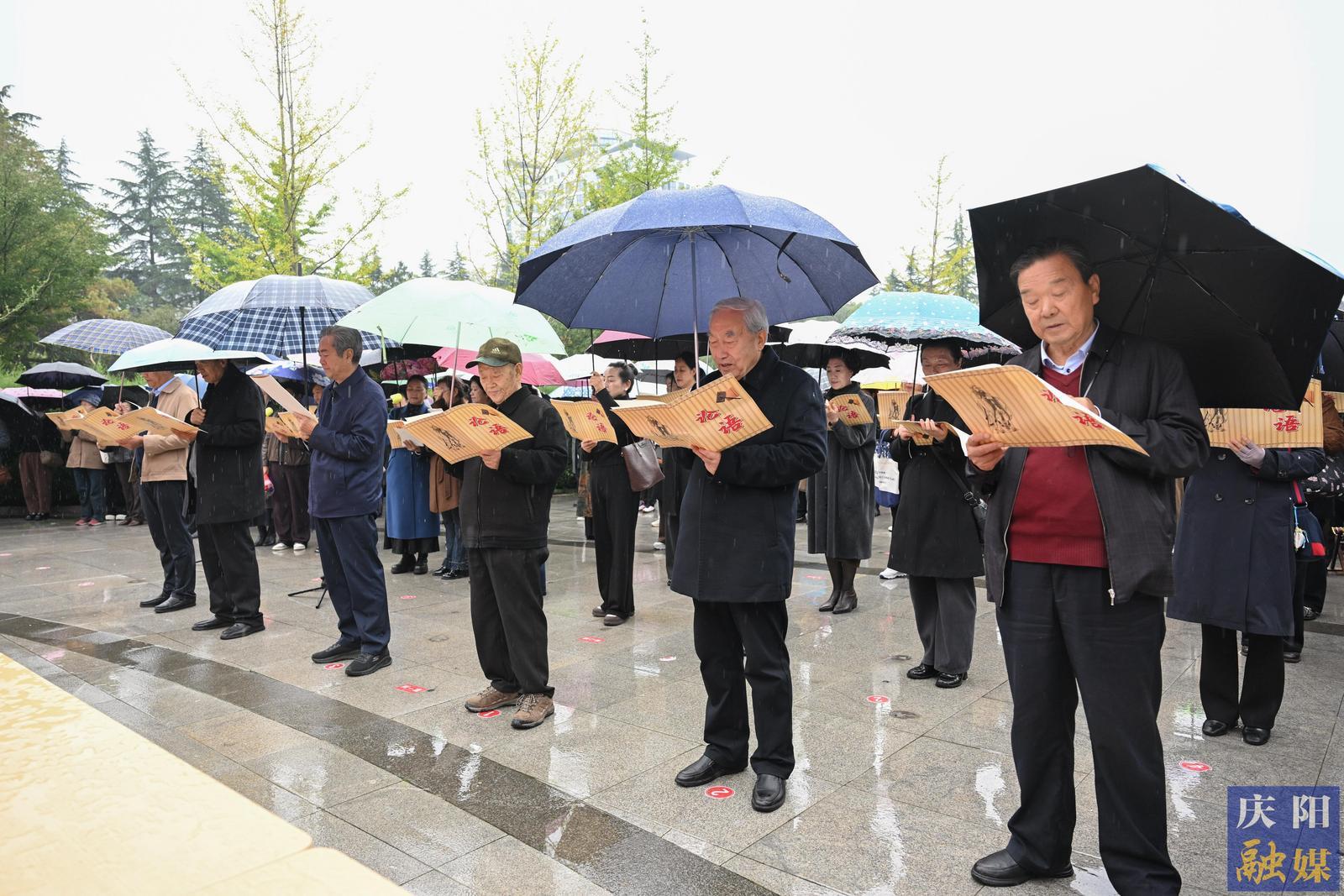秋雨潤澤,更添莊重。全體參與者于綿綿細(xì)雨中齊聲誦讀《論語》經(jīng)典篇章,在朗朗書聲中感悟先賢智慧。儀式還包括向至圣先師行拜師禮、齊誦《橫渠四句》等環(huán)節(jié)?;顒?dòng)尾聲,參與者集體移步慶陽市檔案館,在欣賞《論語》書法長卷的同時(shí),參觀了“中國共產(chǎn)黨人的家風(fēng)”檔案展,為這場(chǎng)文化盛宴增添了厚重的歷史維度。