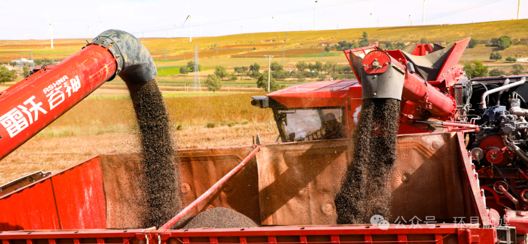 在南湫鄉(xiāng)代家洼村的萬(wàn)畝蕎麥?zhǔn)痉饵c(diǎn),曾經(jīng)絢爛的花海已褪去盛裝,飽滿的穗粒綴滿枝頭,將田壟暈染成一片淺褐。微風(fēng)拂過(guò),沉甸甸的蕎麥穗搖曳生姿,新糧的清醇香氣在田間彌漫。3臺(tái)大型聯(lián)合收割機(jī)開足馬力、來(lái)回穿梭,精準(zhǔn)地將一行行飽滿的蕎麥“吞”入腹中。粉碎后的秸稈被均勻拋灑還田,為土地積蓄著來(lái)年的養(yǎng)分;地頭上,脫干凈的蕎麥籽如金色瀑布般傾瀉進(jìn)運(yùn)糧車,瞬間堆起小小的糧山。