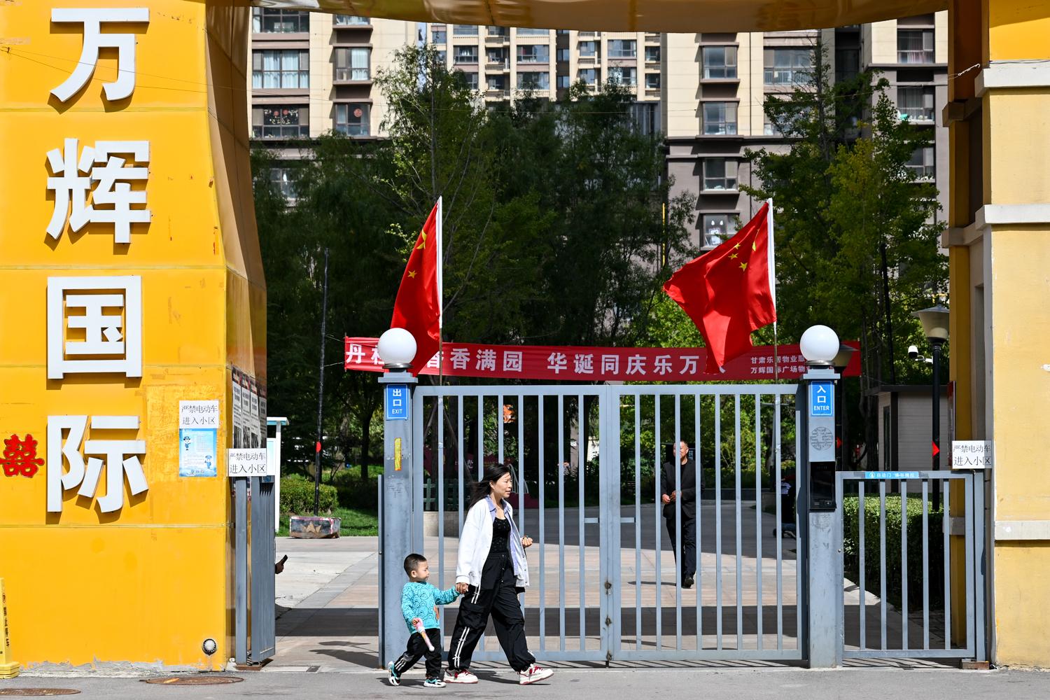 西峰區(qū)萬輝國際居民小區(qū)門前懸掛五星紅旗。