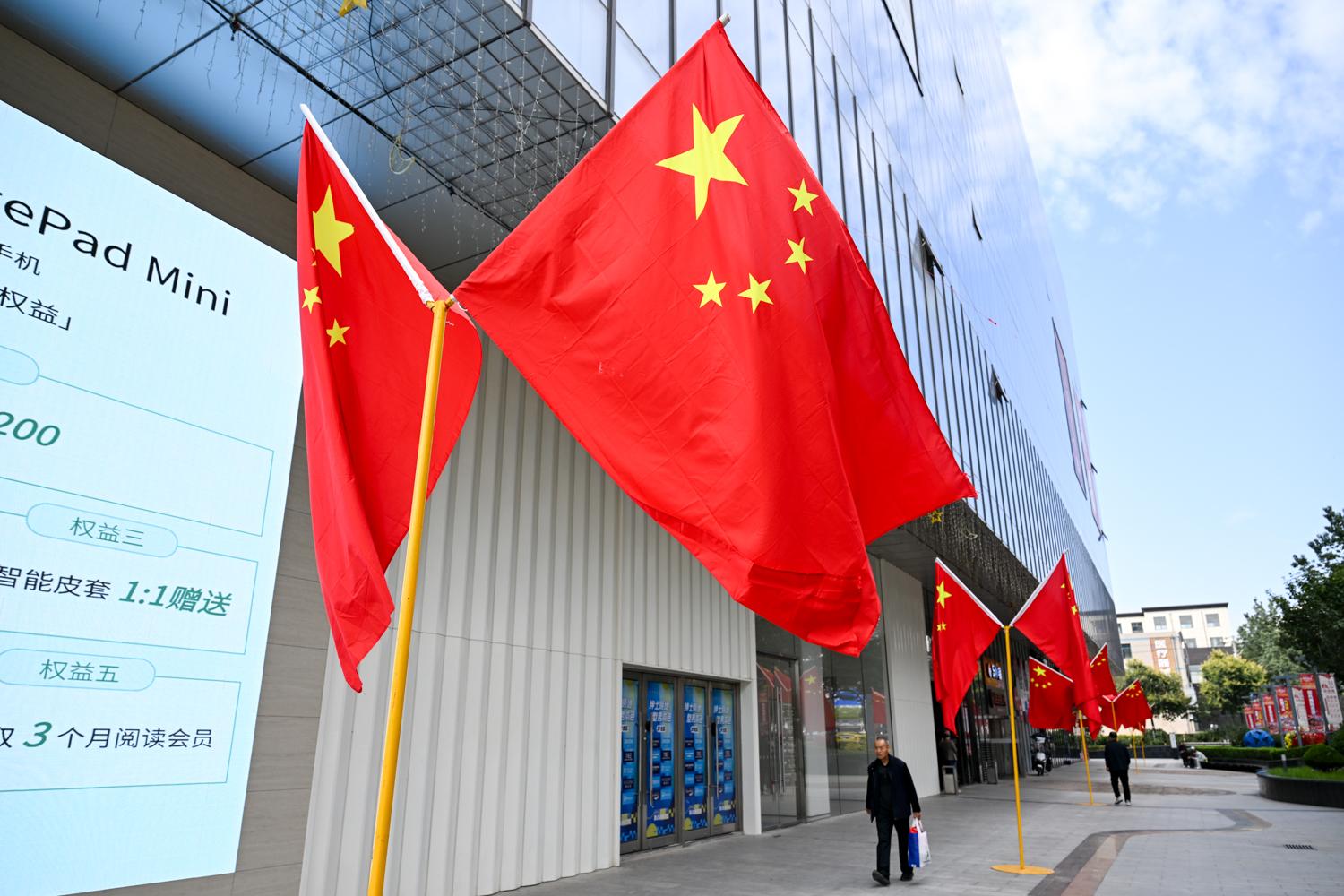 西峰區(qū)一家商場內(nèi),五星紅旗裝扮其間。