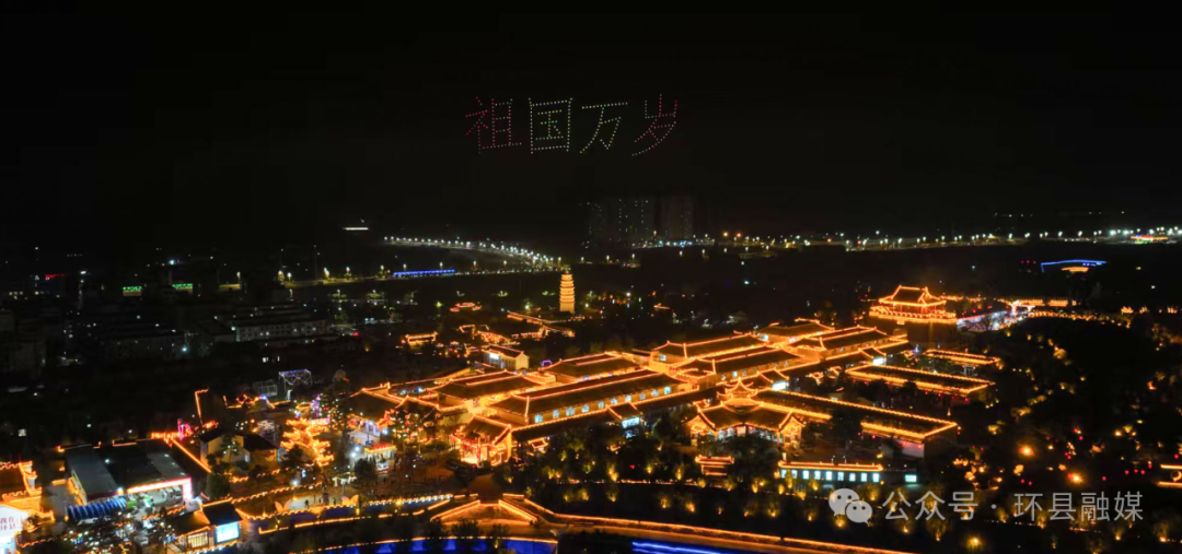夜幕下,300架無人機在環(huán)州故城上空上演光影秀。五星紅旗、和平鴿、環(huán)縣宋塔等圖案依次綻放,引來觀眾陣陣驚嘆。