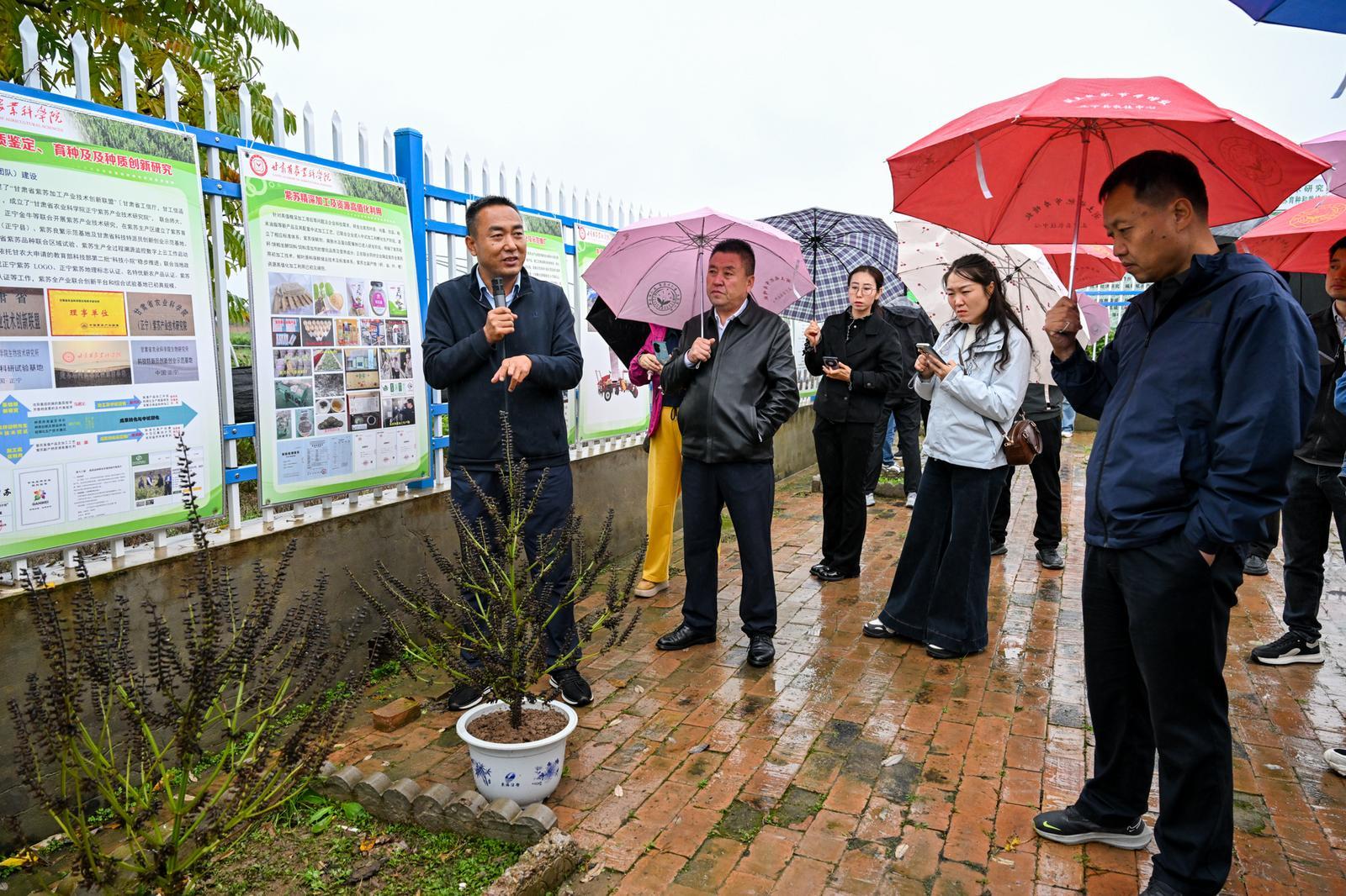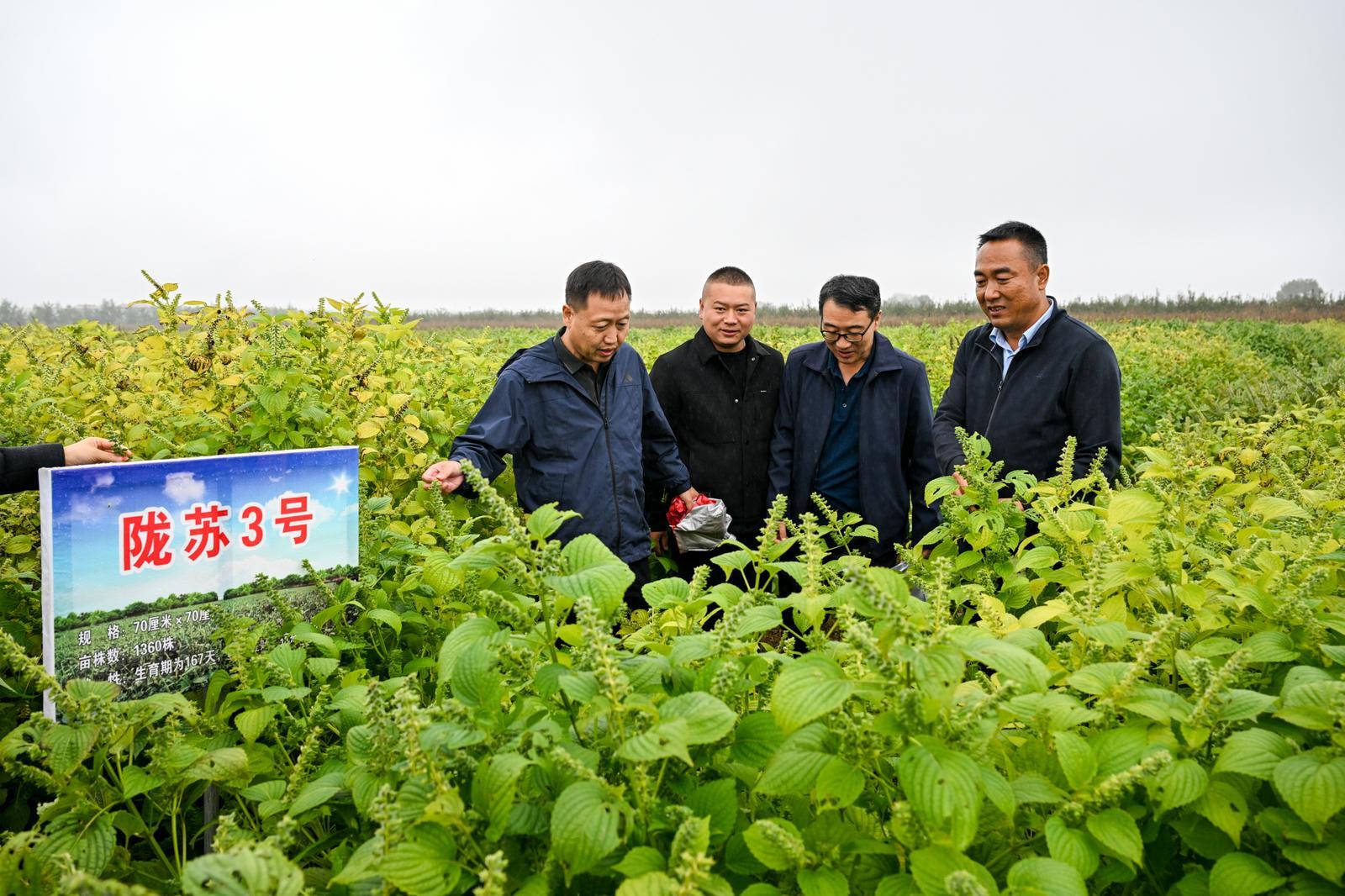 與會人員在西峰區(qū)彭原鎮(zhèn)隴東紫蘇育種試驗基地觀摩交流。